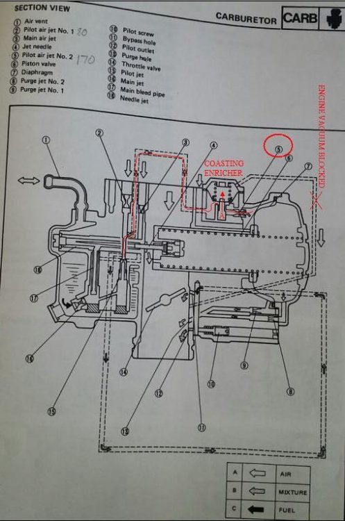 Patch, thanks again for all the time you are putting into this. I've let it sit while I tend to the rest of life. Just to 'splain briefly, the "toothpicks in the Idle Air Jet #2 " was not intended to be a mod, just a test. I was trying to characterize the contribution of those air jets to the idle mixture, to help possibly understand the Coasting Enricher system behavior. Jeremy -