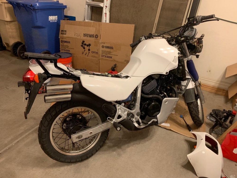 Hi @Steven G, I'm back to snowy Calgary Yes I prepped the Plastic as well as I could, striping, sanding, filling, and application of all the hard core plastic primer and plastic adhesion products I could find over the counter. Sounds like you know how hard it is to make paint stick to plastic! The plastic on this bike had a very rough life of sun damage and some pretty big scrapes and scars. Unfortunalty buying used panels is a rather difficult and expensive venture for this old bike, so I decided to make the best with the old ones. She will never be a beauty queen, but at least if I take her out in the desert and take a spill no tears will be shed if a panel gets scratched. Thanks for the heads up on the clear coats! I did go for the standard white paint (no flake) as it it is easier to repair/touch up in the future as well as I'm no pro painter to be honest.....just a hack who thinks he can use a paint gun and/or rattle can. But I agree, a shiny flake paintjob glistening in the Arizon sun always looks awesome!!! As for driveline, she was in really good shape! All is running A-OK now after some new CDI packs and general maintenance, but I will be doing a carb clean/rebuild as she was sitting alone and unloved for a very long time with gas in her. The Previous owner had a highspeed flat tire incident on her that scared him so much that he parked it in his back yard and just walked away never riding her again for years until I bought it. I agree, tires were a tough choice. I'm not the dirt rider I used to be (too old and crippled now) so I opted for more of a street tred, but enough that if I want to take a rip off road she will be ready! Thanks for your interest and comments on the Bike! Maybe we can hookup for a ride and icecream this summer in Calgary when all the white stuff is gone! I will never lose my "Canadian fur". Ha HA! -