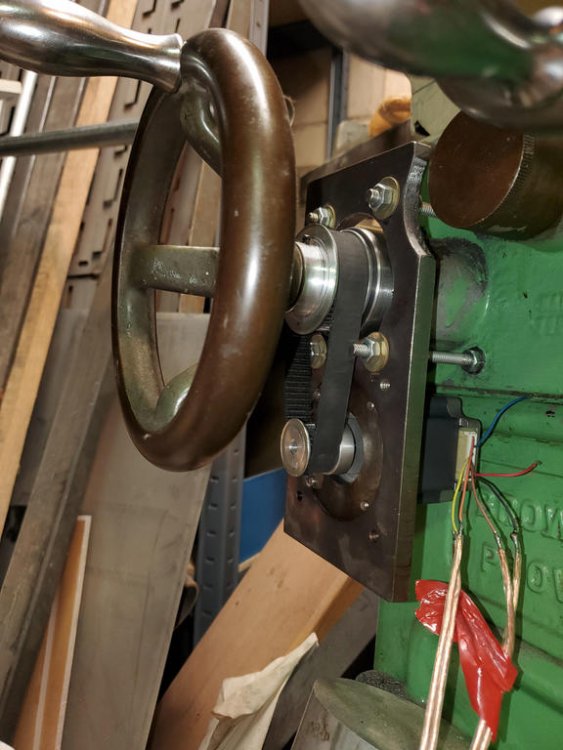 We have more progress. I have the stepper motor and the belt drive all mounted up on the grinder. Plugged in the electronics I built earlier and the table even moves back and forth now. WOOOOOO HOOOOOO I still have to mount the switches for the table reversing. Right now I am just holding one switch in each hand and clicking to reverse direction. But I just had to see the table move under its own power. There are still some issue to sort out. The motor that I have, the ones I got for free, is not quite enough torque to do the table reversing. If I slow the motor speed down to a crawl then the motor can do the job. I am still playing with various setting in the electronics to see if I can up the torque enough without loosing any speed. It is real close to being enough. Remember these motors are different, the peak torque is holding at 0 RPM and the torque drops as you get faster, Opposite of "normal" motors. I did drill and tap the mounting plate, while it was all set up in the milling machine, to be able to mount the next bigger size of motor if needed, so there is also that option still easily available. But that bigger motor option cost more money. But at least we have table movement. That is a big step in the right direction.