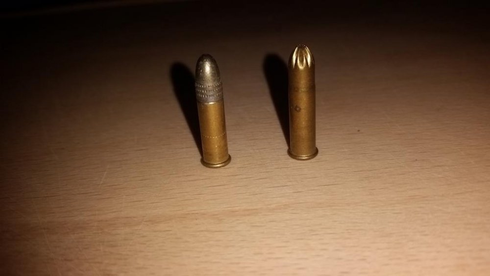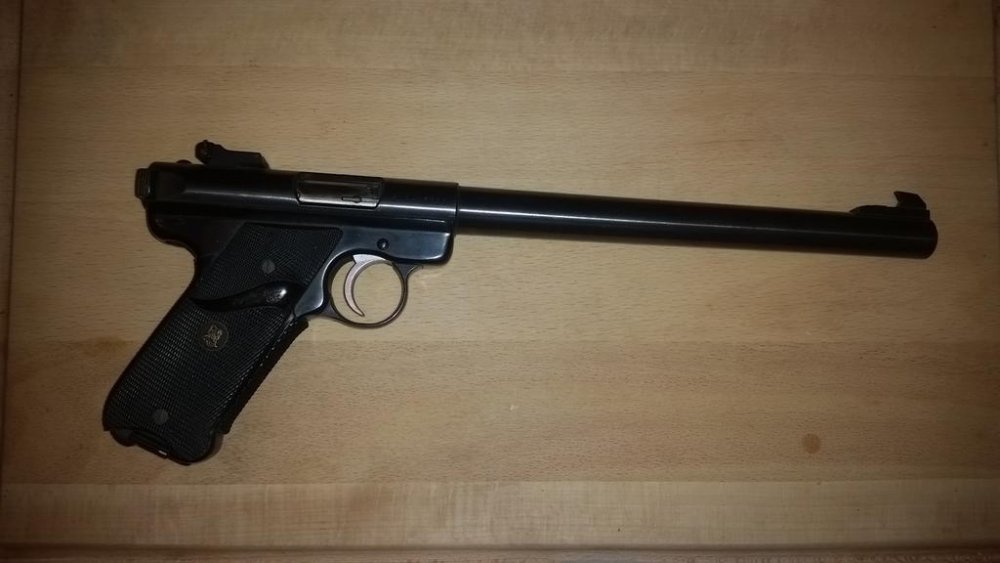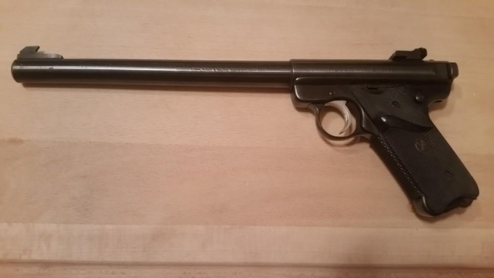 Here are some pics of my 10 inch Ruger MK2 that I mentioned earlier. This gun is still as delivered from the factory with the exception of the Pachmayer grips. It is a 10 inch bull target barrel. I have literally tens of thousands of rounds thru this gun. As I mentioned the extractor is so worn that it will not pull out a fired or unfired round, even just after cleaning and oiling. It does still function normally for firing. The extractor is not used to remove a shell as it is fired, it is the blow back that is doing the work, the extractor just gets it moving to the side to get out the port. Yes some day I will order a new extractor for it. More unique toys to follow........ These are the .22LR shotgun shells that I use for mice in the house. They only have a lethal range for mice of about 12-15 feet maximum. The shot does not damage the paint or wood work in the house unless you are extremely close. You gotta be quick to see the mouse scurrying along a wall and then get the gun and get the shot off before the mouse can disappear. Typically a mouse not visible for more than a few seconds. Great practice for honing your reflexes. I only get 3 or 4 mice in the house a year. The shell with the crimped top is the shot shell, it is loaded with #12 shot. Next to it is a Remington Thunderbolt shell. The #12 shot is so fine that you are not going to find the pellets on the floor after a shot. The shot shells are also fun when sitting around a campfire picking off assorted bugs that fly by.