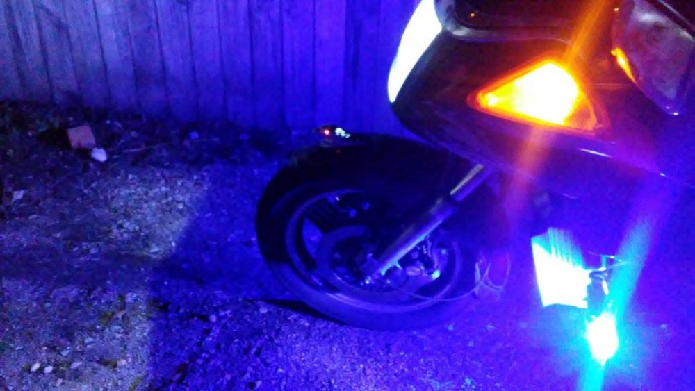 I have the same lights on my bike only I went with bluish halo and I can switch them from bright dim and pulsing. I can also switch out a wire on them where they are red in color, kind of like show light I guess. the beam on the fence is from the spotlight fog light. I have my aimed outward for getting light in the ditch side of the road. Trying to drive for them reindeer. They work somewhat. I have seen the 4 led lights thinking about trying those out to see which I like better. I would like to know where you found the white halo tho. when i got mine all I could find was Red big no no Orange/amber, and the blue.