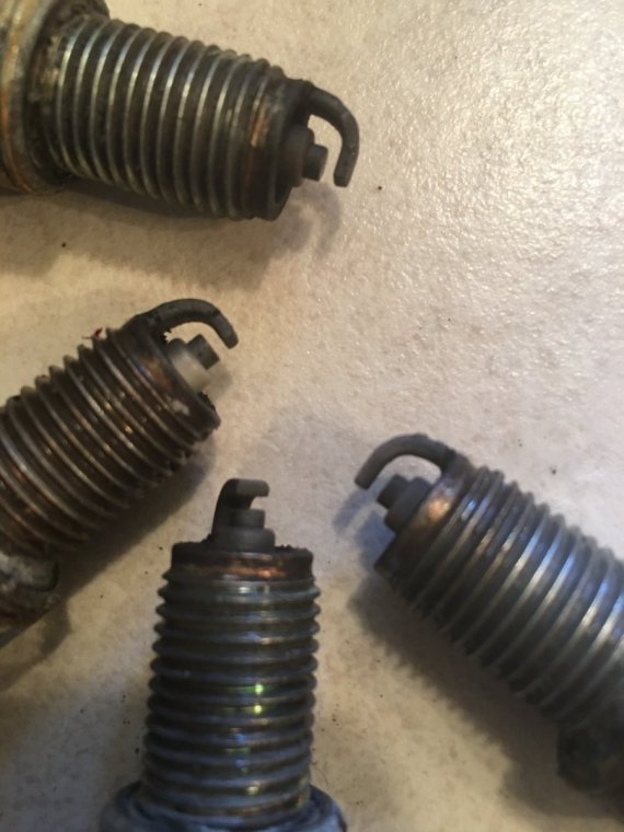 Top plug in pic was dirtiest and came from RH rear cylinder. I pulled the cover off carb diaphram for that cylinder and it had a little oil in it. Enough to wet finger.