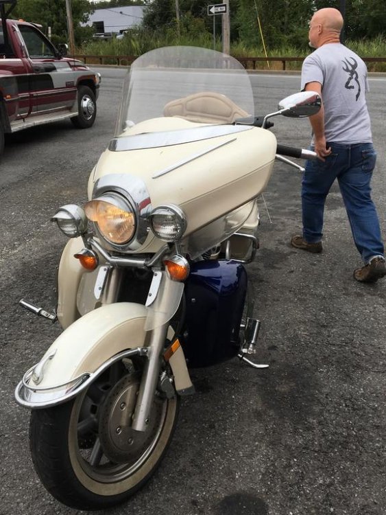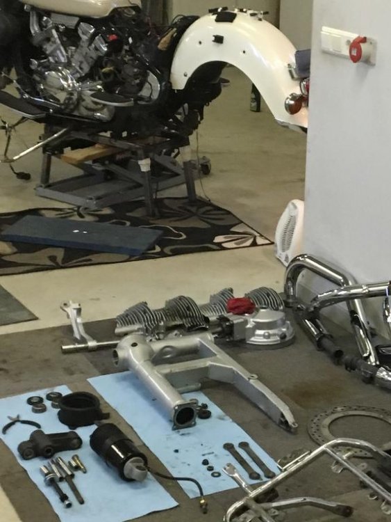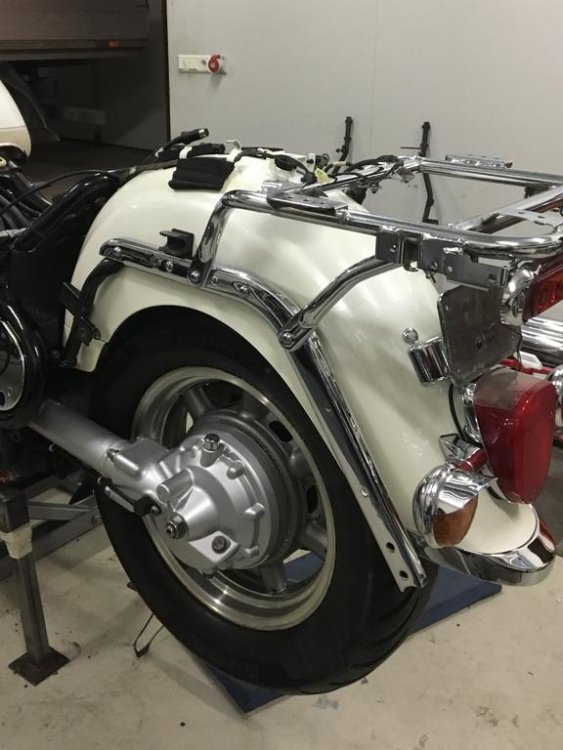 Bought a Millenium 2000 Venture about 4 years ago in the States without seeing it and my good Buddy Craig (cecdoo) went and picked it up for me and kept it in his garage for 4 years - What a friend. Last fall when I was in the US I stayed for some days at Craig´s and Kim´s lovely home in PA and with the help of Craig we took the bike half way up to Main to a transporter that delivered it to the shipping yard for the voyage to Iceland. Will never forget when I walked into Craig´s garage and laid my eyes on the bike for the first time - and said to Craig: Did I actually buy this heap of Cr,,, Craig ?? His answer was simple: YES you did. I have been thinking of selling it for spare parts but I actually think it will shine up pretty nice ! Well to make a long story short the bike arrived in Iceland mid October 2017 and I took it to my workshop and started looking at what needed to be done - man that list was long: 1. Badly leaking Valve cover gaskets: Adjust valves and replace gaskets, clean the carbs and adjust floats, carbtune. Replace and relocate the fuel filter. Replace air filters. Replace oil filter. 2. Looking like it had never been serviced: Change ALL and EVERY fluid. Back and front brakes, clutch, rear drive, fork oil and cooling liquid. change all brake pads and install speed Bleeders for brakes and clutch. 3. Electrical wiring was shady to say the least: Go over all the wiring harness, solder dubious connections, add relays, change connectors and prevent the harness to catch fire (there was a real danger of that), do the ignition ByPass, part out added shabby fuse box, rewire heated grips,horns and driving lights. Rewire the whole horn harness. 4. Service all greasing points: Tear off the rear end and go over the drive mechanism, grease the splines and drive shaft. Remove swing arm and pack bearings. Remove shock, dog bones and the chunk that holds the spring in place, clean and grease everything up. 5. The body work: Replace lower left front fairing and repaint both fairings. Repaint the trunk lid because of cracks in clear coat. Replace some of plastic covers in lower front fairings. Paint all black plastic in the Pearl white color of the bike as well as the steel cover for the rear brake resorvoir. 6. Replace both engine guards: Both engine guards proved to be bent beyond repair so both had to be replaced. 7. Cleaning: Degrease all and every part of bike, frame, engine, body you name it - the whole bike under and over. Buff chrome and other parts with rubbing compound. Polish everything to a high gloss shine. Buff heads of rusted bolts to chrome shine. Remove and buff front wheel covers and tripple tree. Replace fork covers with some chromed ones. 8. Seats: They looked like dark brown and had to be thouroughly cleaned. Patched the driver seat and cleaned the others. Came out almost like new. And the list goes on and on,,,,,,,,,,,,,, Well I am almost done - The last thing needed is adjusting the valves and replacing the valve cover gaskets. Install the carbs and the rest of the bike and she hopefully will fire right up and be ready to go,,,,,to a new owner !! Here are some pictures from the process - Craig was right - She is beginning to look pretty nice Would not be here if not for Craigs patience and help. Best bike keeper ever