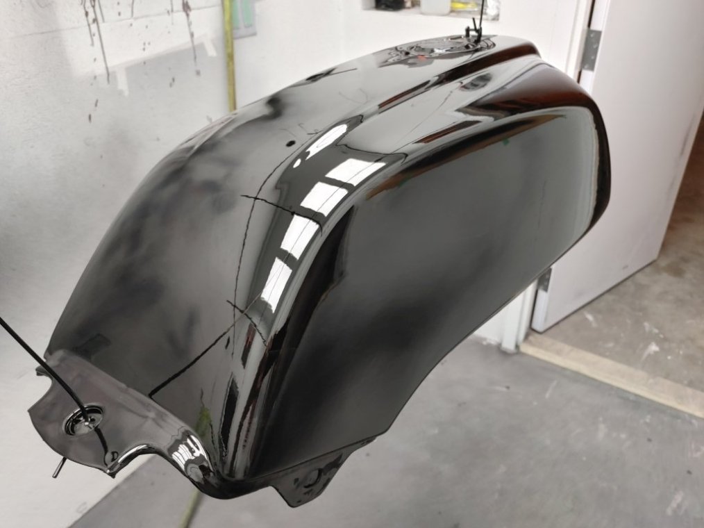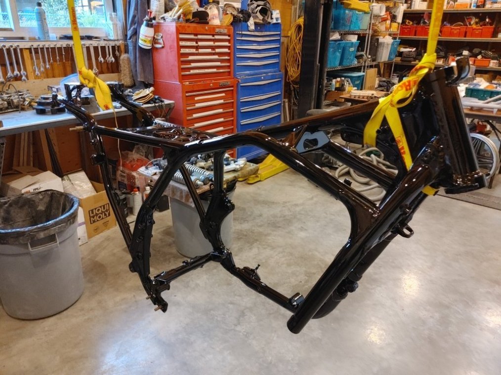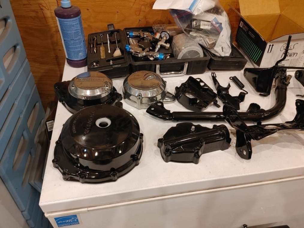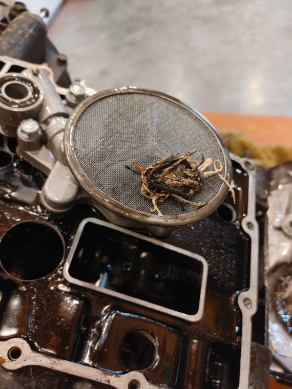 It was a mess and covered in corrosion and rust, I had to strip it down completely to nothing and work all the rusted parts back to life. Somebody had used a heavy sealer on the engine casing as you can see on the picture but there is a good picture of why it is a good idea to have an oil filter screen in the bottom of the engine. I just received the decal pack finally so after I polish the clear on the black I will get the decals on and then put another 3 coats of clear on and then wet sand and polish paint. Should look quite good when it is finished. Am hoping that by the end of June I should have it fired up for the first time in 30 plus years..... Everything inside is new so it will be like breaking in a new bike all over again. I Cerakoted the cylinders and the head which should give me 1800 degrees of protection on the finish. Thanks Chris -