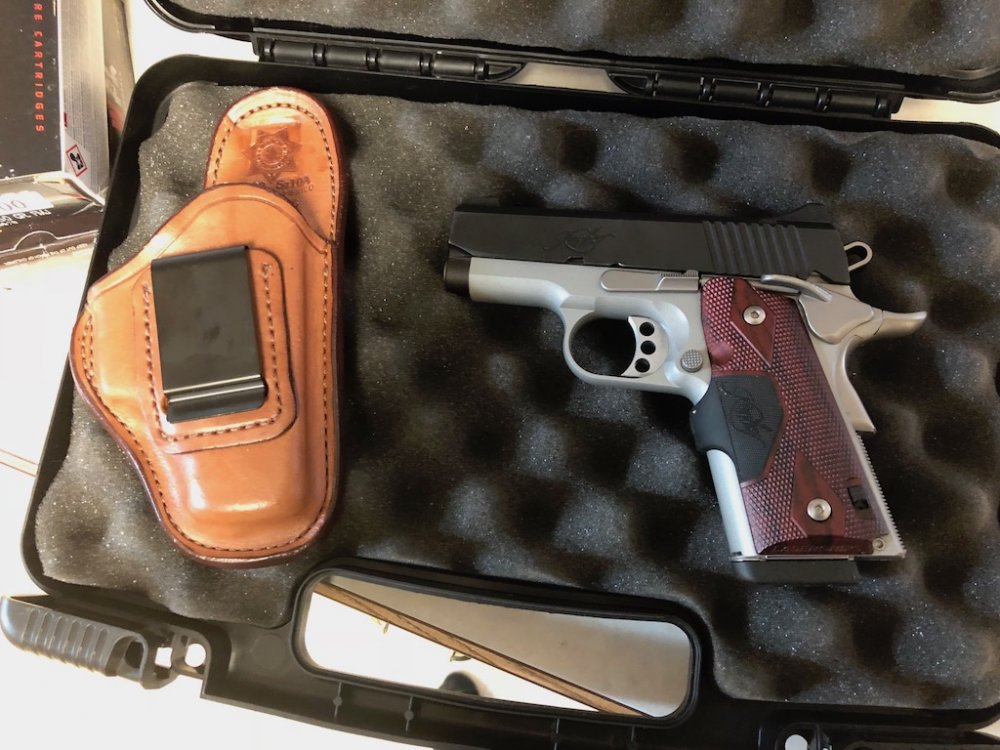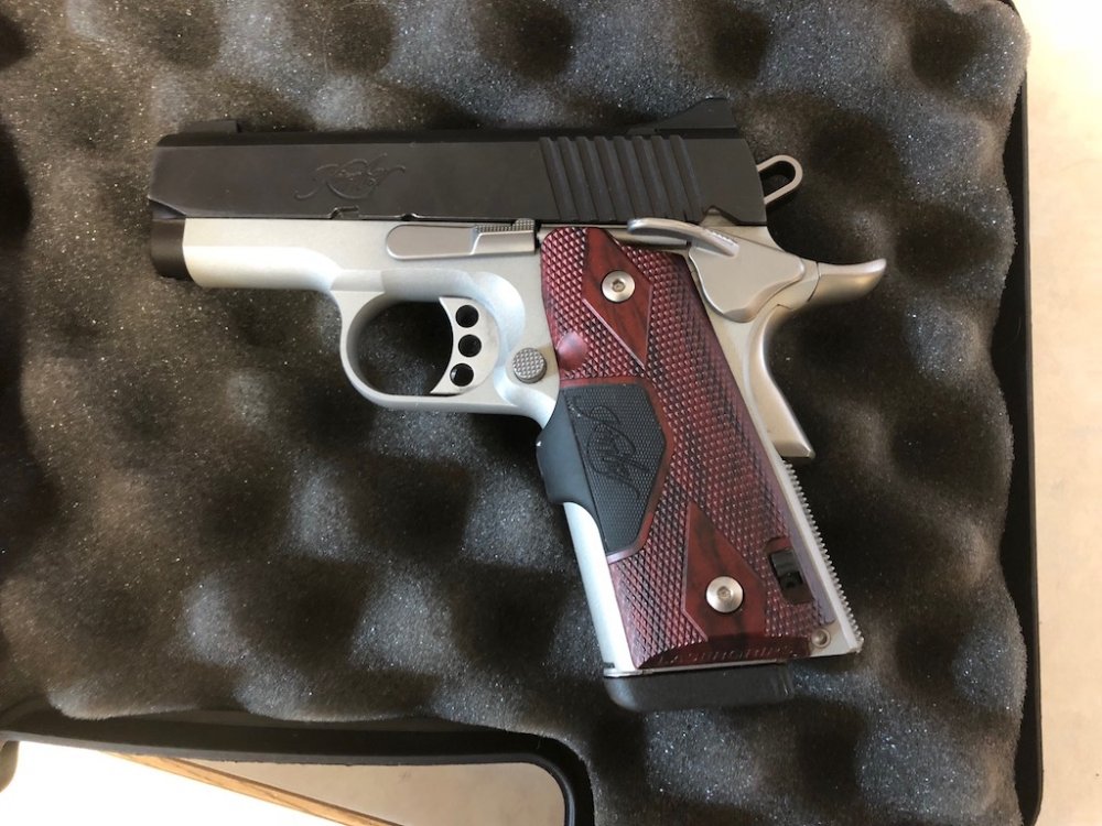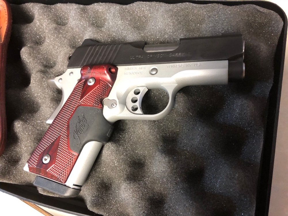 Well, I completed the trade today. Installed a used stairlift and we finalized the deal on the Kimber. He also had a brand new Savage .223 rifle with a nice Nikon scope that he offered to trade along with the Kimber. It had been shot just enough to sight in the scope and looked brand new. Walnut stock, looked to be a parkerized black barrel, very nice gun. I just really didn't need it so declined on that one. I already have a Ruger Mini 14 in .223. Anyway, he bought the Kimber brand new. It is an Ultra Crimson Carry II. It has had about 1/2 box of ammo shot through it. He bought it, 5 boxes of ammo, and a nice Bianchi leather inside wasteband holster. It was his only .45 so he gave me the 4 1/2 boxes of ammo that he had left plus the holster and the original plastic case. He also included the extra magazine that he had bought. Very nice gun. First one I've owned with the laser sights and I'm sure I will try it out this weekend.