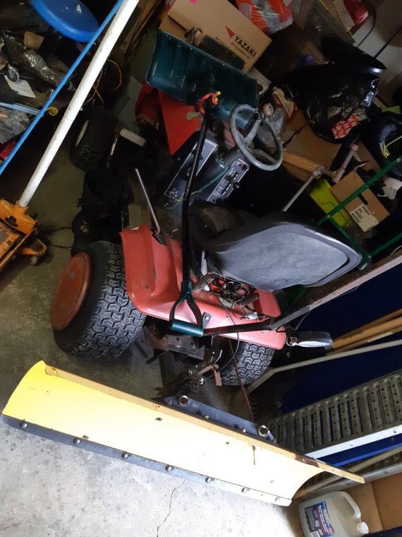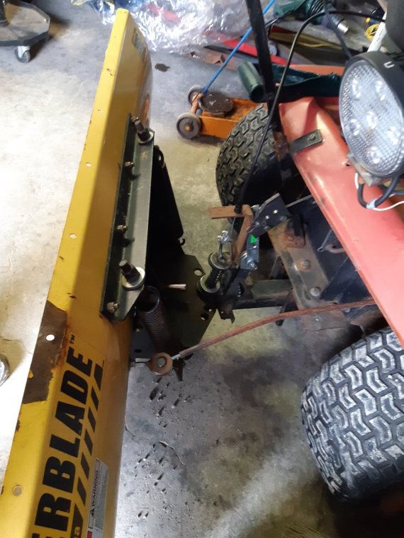 First picture: bent bar on right goes thru body where deck raise was and connects with rod inside then out to a set up that when you pull back it rotates bar then lift blade which is mounted to frame ahead of rear tires. Bar next to bent bar and beside hood is mounted to frame with threaded rod thru body to blade with eyelets which when pulled to back it rotates blade to left then when pushed back forwards it rotates to right. If you blow up 3rd pic. you should be able to see where it pushes back then pivots blade to go up.Rod on left fender is for forward and reverse There is a cable under seat that I pull to lift eye bolt up to let blade swing either way. Works much better in reverse than forward as it can turn sharper onto sidewalk instead of back and forth to line up when going forward similar to driving tow motor.