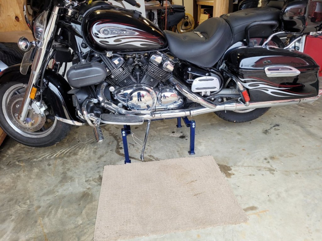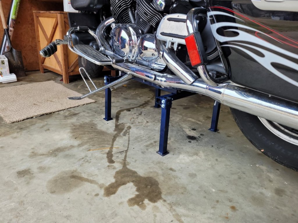 This week I met with RDawson and picked up one of his lift adapter w/ legs. First, he is a great guy and fabricator. Today, I was able to put the lift to use. It is extremely well made and simple to use. Since this was my first time to lift my RSV, it took a bit of gentle persuasion to get the rod thru the second tab on the underside of the bike. Once in, tap it thru and lift away. Bolt on the legs (perfect fit) and lower it onto the legs. It is now sitting rock steady and solidly elevated and ready for service. Thanks Ronnie. My only regret is not getting it sooner.