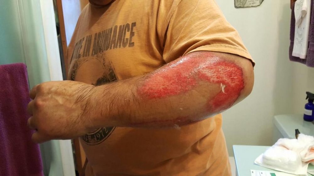 The jacket is a high quality jacket. The jacket leather was scraped but intact, not ripped up at all. The abrasion/burn came from inside the jacket. Some of the nylon mesh liner fabric is melted. I turned the sleeve inside out and found a good supply of my epidermis.
