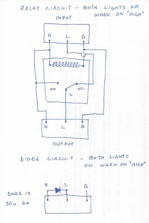 The recent thread on diodes couldn't have been timed better and I am still whacking myself in head for not thinking of this myself since I have some background in electronics. My goal this winter has been to replace the stock headlight in my 1st gen with a pair of Rigid Dually Spots without making any major modifications so that if needed, I could return the bike to stock. The Duallys fit nicely side by side in the stock headlight bracket opening after removing the frame that holds the lens assembly from the bracket. With some spacers and by drilling a couple holes in the bottom of the bracket I was able to position the lights near the center and fitting the lights was the easy part. I then adjusted one of the lights to cast it's beam higher than the other. The goal is that when on low beam the light with the lower beam is illuminated and then when on high beam both lights would be on creating a low beam-high beam effect. I also was able to retain the use of the headlight adjustment knob. The dilemma was how to tie the lights together when power is applied to the high beam circuit. My original intent was to use a relay to accomplish this but after getting my memory refreshed on the function of diodes I simply calculated the load and went down to the local electronics store and grabbed a 50v 6a diode. The amp draw on the Dually is 1.1a so 6a should be more than adequate. I simply had to solder the diode across the low and high beam wires in the proper direction and whalla, done, and so simple. The following drawing illustrates the two scenarios and as you can see the diode is much simpler and has no moving parts. The relay is shown in the "low beam" mode. Please note that I had already completed the mod to the dash electronics and to the reserve lighting unit as I converted the bike to all LED's long ago. I am now working on cleaning up the install and adjusting the lights. I will add some pictures later on. Any of you who have used these lights know that they really cast a good beam that I would say is superior to HID. I expect to have plenty of light going down the road with these and the set of Dually floods that I have mounted off my custom horn brackets with all four lights drawing only 64 watts and roughly 4.5 amps! Now before I hear about the legalities of such a modification, let's just say I'm willing to take the chance to dodge critters get good vision at 4:30am when I am traveling my 23 mile commute to the radio station each morning. Plus, I think with proper adjustment the five-oh will leave me alone. I' hoping so anyway! More later...