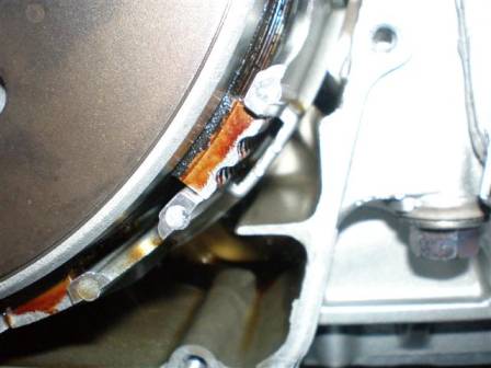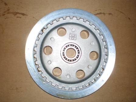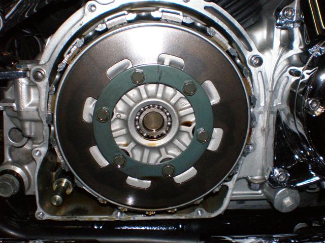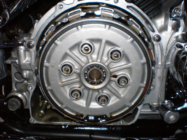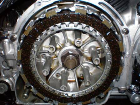 When the cover is off, make note of the marks in the clutch basket and on the clutch friction plates. On the basket you will see at one point (5 o'clock position) there are two marks in the basket. You will also see that the with the discs in that all the discs have two marks also. At the 11 o'clock position you will also see one mark in the basket and the same mark on the friction plates. These marks are very important when you reinstall the friction discs. They MUST be lined up.