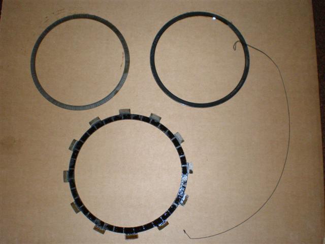 All the way in on the cutch, you will see where you took the plates and friction discs out, a wire. Remove this wire. You will need to break it. This holds in a steel disc like all the others, a half disc and a spring washer. You need to take all of these out. These parts are the parts that you will trash if you choose to upgrade and put in a full size disc. If not, keep all these parts and take note how they come out so that you can return them as they came out. Make sure you get everything out. There is a flat steel washer in there that you have to work at getting out. It does come out and when you get it, the inner surface will be completely flat. Below is a picture of the parts that will be discarded in place of a full sized plate. The plate you will use is the same plate and part number as the rest.