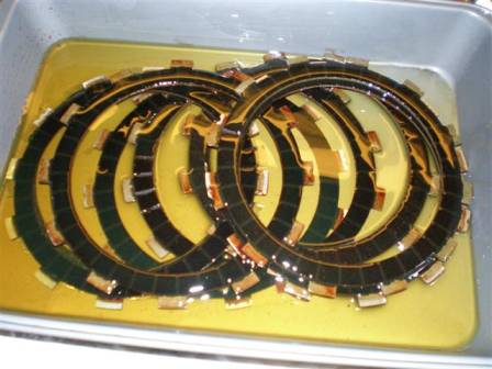 Whether you are installing new friction discs or jsut upgrading and installing one new one with all the others, they must be soaked in oil. As the RSV is a wet clutch, the discs are meant to absorb oil to work properly.
