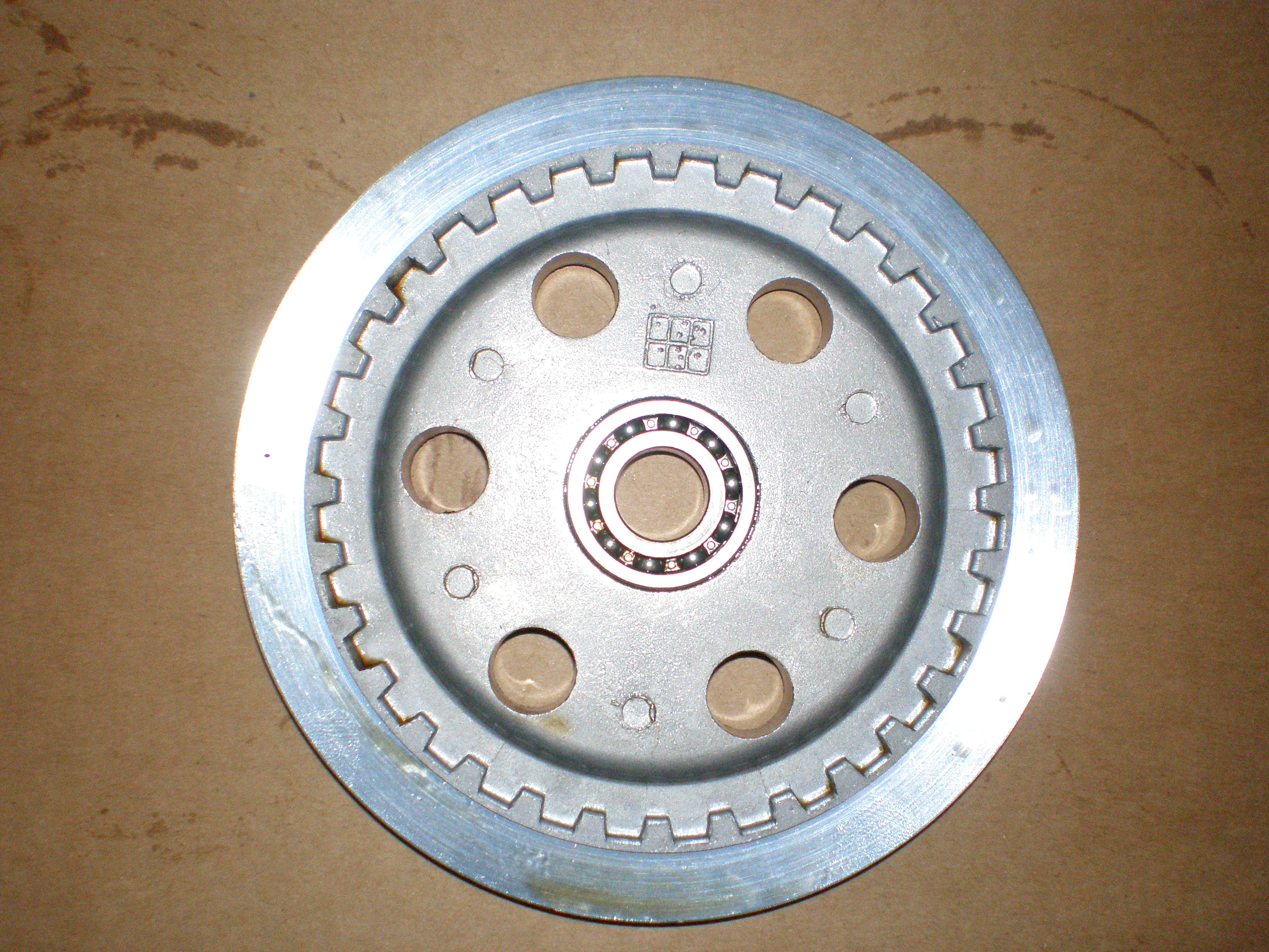 Next you will put on the pressure plate. On the back side, you will see that the plate has splines that will match up with the teethe on the inner clutch basket. If these don't fit together correctly, the spring will not sit correctly. After you have this in then place the spring on next, making sure that the small ring is sitting in the groove on the front side of the pressure plate.