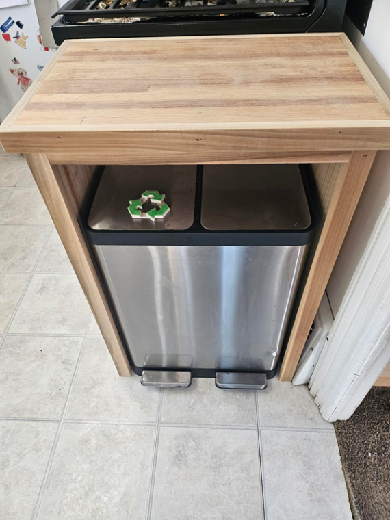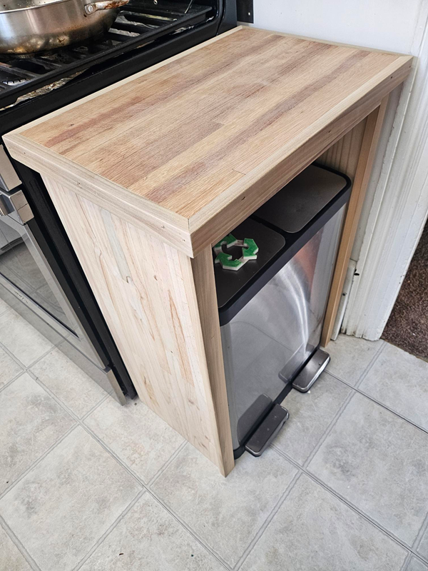 Our kitchen is decidedly lacking in counter space. The spot next to the range where we keep the recycle/garbage bin is about the only area it is feasible to add any horizontal surface at all. I'd been thinking about building this for a while, but just got to it yesterday. Some wood filler on the nail holes, milk paint, and Renaissance Wax are all that's needed to finish. That'll will probably be more work than building the stupid thing!