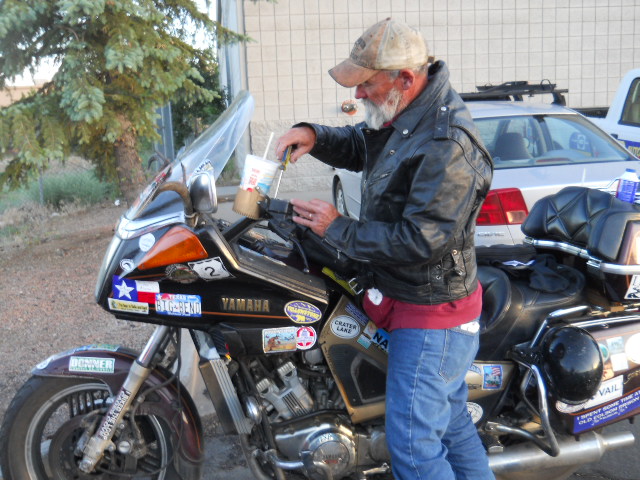 cowpuc Posted January 24, 2015 Author #77 Posted January 24, 2015 (edited) Tweeks and I have got an agreement between us, I try to take care of her and be somewhat reasonable in my maintenance habits and she does her best to get us home in one piece.. One of the things she has always enjoyed is the switch from 15w/40 oil to the heavier 20w/50 that I use when running the desert regions.. When Squid and I were talking on the phone about doing the stator repair on Tweeks, he told me he had a good clean oil pan to salvage Tweeks oil so I wouldnt have to change it when we put the new stator in her but advised me to pick up some oil if I wanted new.. I had just put new oil in Tweeks before we left Michigan so I opted for the salvaging.. As we pulled into Flagstaff,, better known as "Flag" to us modern contemporary folks, I noticed that Tweeks clutch was feeling funny and, she had been a little sticky in her shifting too.. A NAPA Auto Parts store caught my eye as we rounded a corner in Flag so we pulled in.. I love Auto Parts Stores.. I have changed out Tweeks oil in all kinds of places like Dollar Store parking lots, Walmart Parking lots,, even resturant parking lots but, when it comes to on the road oil changes, my favorite spot is the good old all American Auto Parts Store.. One of the main reasons for this is that I am basically lazy.. I dont like to bother Tweeks right saddlebag (her maintenance department) unless I have to.. Not only am I lazy but, it seems like every time I go pawing around in all those parts and tools she has hanging on her side, Tweeks takes it as a sign to take a break from her side of our agreement and I end up "Tweekin" on her,, a Murphys Law as it were.. Most guys, and some women, that I hang out with know that Auto Parts Stores not only carry parts and pieces but they will also loan you tools,, especially if you act like your a needy person that is gonna buy something from them and than leave town (so they know that whatever you bought has a zero percent chance of being returned).. They also normally have a tank to dump used oil into, free little funnels and sometimes - even free coffee.. The NAPA Auto Parts Store in Flagstaff was really nice and was staffed by some great people.. I grabbed some 20/50, a small container of Brake Fluid (to fill the clutch master) and walked up to the counter.. Gave the parts guy that sad "I am from out of town look" and asked if he had a Phillips Screw Driver, Big Cresent Wrench, Oil Pan, Paper Funnel and a pair of pliers I could borrow to swap out the oil in my bike.. He looked me over, smiled and said - sure,, why not.. He also handed me a couple of shop towels as he followed me out the door to admire Tweeks.. He looked her over, mumbled something about wishing he could join us on our tour and went back inside.. After the oil drained from Tweeks main oil pan, I capped it, moved the collector pan under her filter housing, loosened the filter housing and drained it too (I dont usually swap filters on the road).. Pulled the little plastic cover off Tweeks oil fill area, unscrewed the cap, stuck in the funnel and put Tip to work dumping in oil.. I took the screw driver, stuck it in a clutch master cover screw, grabbed the screw driver shaft with the pliers and popped the screw loose, jumped over and snapped the other one loose and backed em both out.. Popped the cover, sure enough, low fluid.. Filled the res and told Tippy we'd better take the remainder of our brake fluid with us cause Tweeks was probably gonna need an occasional refill (seals dont last forever).. Returned the tools, dumped the old oil, shook hands and thanked the Parts Guy for his hospitality... He asked where we were headed and shook his head when we told him we were gonna camp down on 89A and then go down to see Jerome, than head to California.. He smiled and said - "you two have fun and be careful - wish I could go with ya".. 89A is a really neat side road that goes down to Jerome from Flag (I am sure it goes farther but Jerome is a far as I ever did ride it), it winds thru rock canyons, dense forests that have lots of Elk and other wild life.. It is, in my opinion, one of the countrys prettiest tours for motorcycling and I had been bragging about it to Tippy for a long time.. That said,, you can only imagine the sadness that over took us as we came to the beginning of 89a just south of Flag and saw the "CLOSED" sign on it!! As we continued down the ick-spressway (I think that is 17) toward Sedona, I told Tip that it was ok,, we would just have to make another trip out just to ride 89a!! As it got later and the sun started to go down, we were still in the high country the makes up the landscape between Jerome and Flag.. I had forgotten about the altitude differences between Sedona and Flag and quickly remembered as the temps dropped drastically.. We stopped to put on our gloves and balaclava's (nylon hoodie thing that makes me look like one of the Nights Templar who were guarding the Holy Grail in that Indiana Jones movie).. It finally warmed up as we were pulling into Sedona for dinner.. After we finished our chili, we loaded our jackets back up, stuffed the winter clothing back into Tweeks left saddlebag (clothing department), filled the water jug and stumbled off into the dark to find a camping spot.. We started to put the tent down on the grass beside a shopping mall when it dawned on me of how narrow and busy Sedona is.. The town has this series of round abouts that go thru the area and the round abouts that we were near were doing a lot of round abouting.. Way to much to be able to actually sleep thru the noise.. I tightened the tent back up and we went exploring.. Just a short distance out of town, things really mellowed out. I pulled off into the foothills on a two track and found the coolest camping spot.. The air tempts had dropped just low enough in the valley to make falling asleep a breeze, Tip proved that once again as I could hear her stacking logs