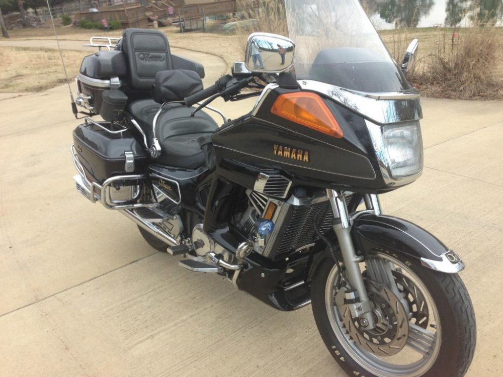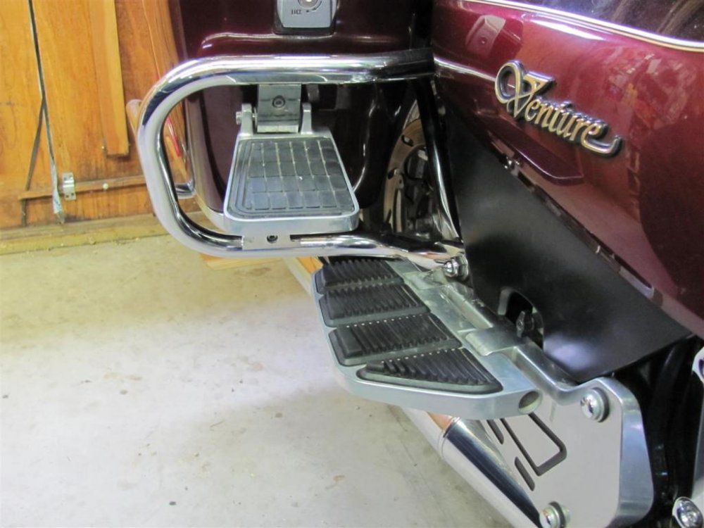 Prairiehammer Posted July 27, 2015 #40 Posted July 27, 2015 (edited) Regarding the original inquiry about the tabs on the front of the saddlebag guards: Yes those tabs are where the helmet locks were mounted on SOME 1991-1993. My 1991 has helmet locks under the trunk, but a friend's 1991 (below) has the helmet locks on the saddlebag guards. As for the aftermarket passenger foot risers that are mounted to the front of the saddlebag guards; those were manufactured by Kriss and were called "Starsteps". Kriss made them for Ventures and for Gold Wings. Yamaha offered them as an official Yamaha VentureLine accessory (ABA-1NLCD-20-00). The VentureLine version of the Kriss Starsteps has the Venture Vivaldi "V" engraved into the bottom of the foot riser. The non-VentureLine Kriss Starsteps have a "shooting star" logo cast into the step bottom. I have a set of VentureLine Starsteps, shown here on my 1990. I have since transferred them to the 1991. Debbie finds those Starsteps quite useful, allowing for different foot positions. Edited July 27, 2015 by Prairiehammer