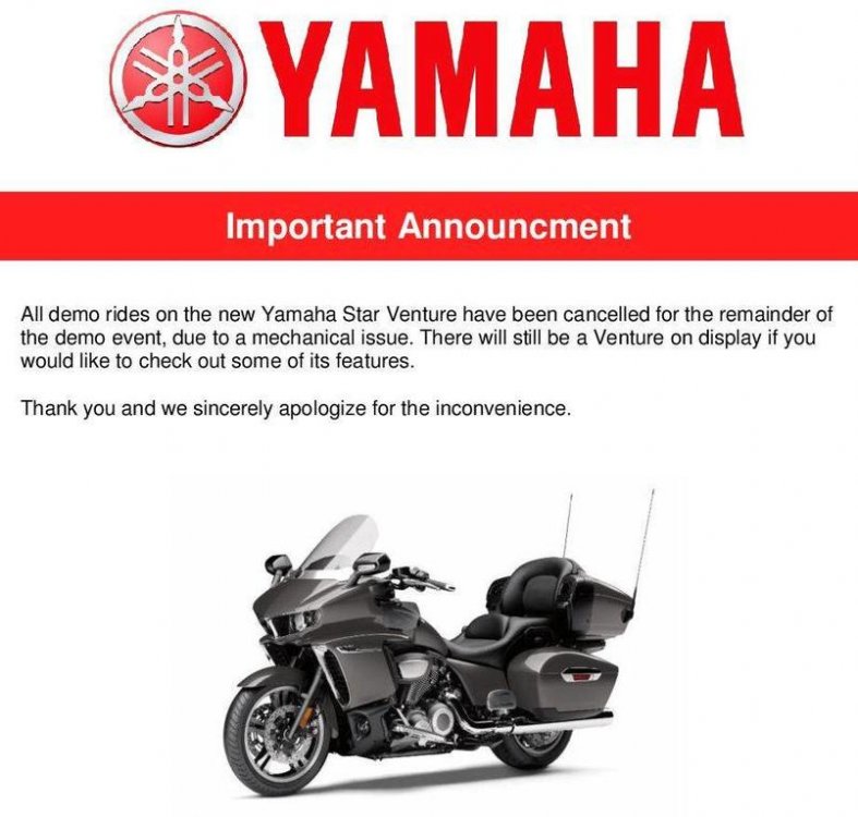 bostonlawman2003 Posted September 9, 2017 #1 Posted September 9, 2017 Just saw this posted from the local dealer that has the Yamaha Demo Truck for the weekend. All the time slots for test rides on the 1 Venture they had on the truck were full, I hope they are explaining to everyone exactly what the issue is and not just leaving it at a "mechanical issue" This was posted at about 5pm this afternoon on the Mom'South facebook page, Mom's is a dealer out of Manchester, NH, Mom's South is their location in Foxboro, MA. Here's a link to the page if anyone is interested in seeing if there is any follow up to this photo they posted.