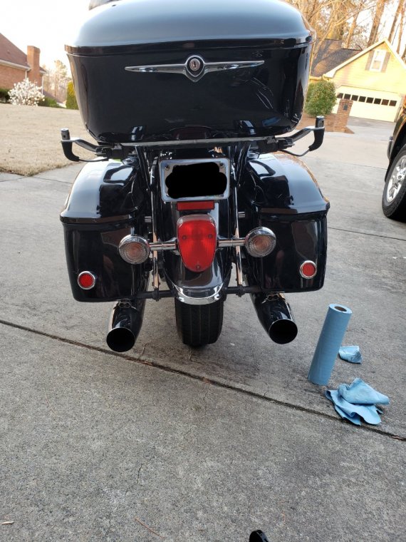 Removed the luggage rack from the trunk, removed the saddlebag guards, and addressed the indestructible adhesive left behind by a matching pair of reflective "Jesus fish" someone stuck to each bag. Not sure what they used to attach them, but it appears to be either super glue or epoxy. Hard as a brick, and impervious to acetone, Goo-gone, alcohol, heat, plastic scrapers, etc. Only options were cover-up or sand and refinish the bags.