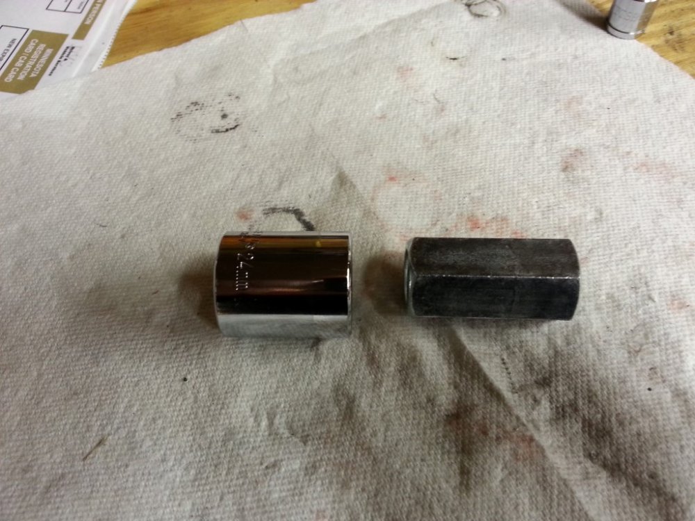 1. The 16mm coupling nut has an internal thread size of 16mm but the outer size of the hex nut is 24mm and therefore fit into the 24mm socket making a 24mm hex bit socket. Here is a picture of the tool. I ended up using masking tape to make sure the nut stayed in the socket. I tried the 13/16 sparkplug socket turned upside down but I didnt get a good bite with it. 24mm is about 15/16 so I went looking for something in those sizes and found this coupling nut. It is 2 inches long so there is enough room for it to grip and the cost was very reasonable. It was located in the Menards metric bolt section and has Handi-Pack part number 88319 on the package. Hope this clears things up a bit. Rick F.