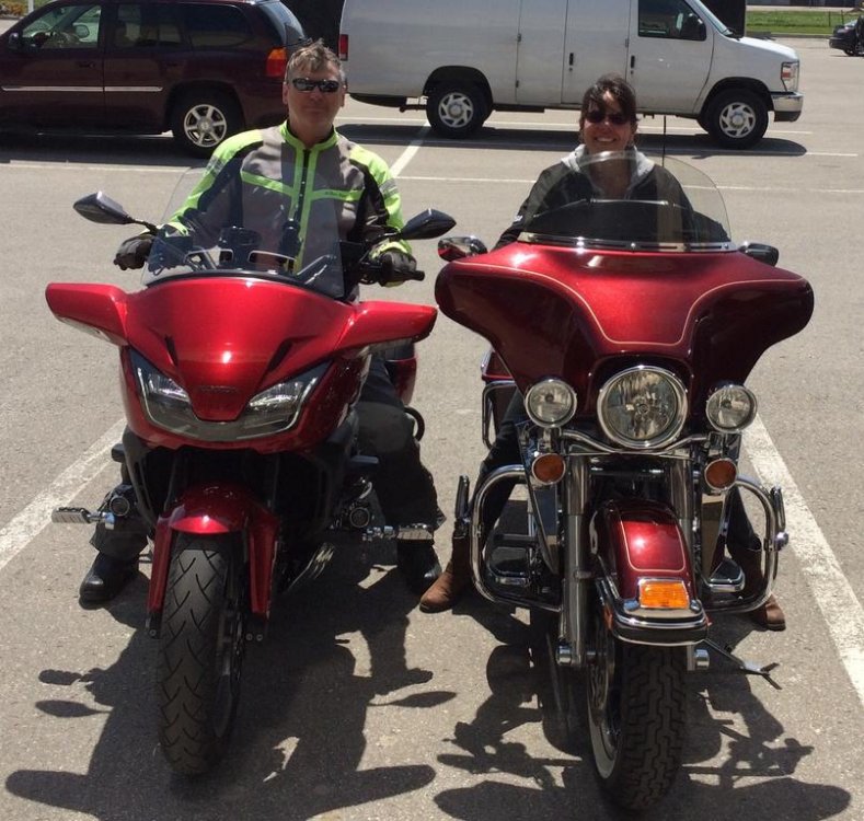 Well she did it right she rode an old Honda Rebel 200/250 not sure which it was, for years. As a Mom of 2 kids, 1 of which had major Heath problem, she didn't get much time to ride. As the kids got older, she finally bought a Yamaha Virago 750 and her youngest daughter got the Honda Rebel. Then her daughter wanted to move up and ride the Virago all the time. So they sold the Honda Rebel and my Sister bought herself a Virago 1100 and her Husband had a HD Heritage Classic. They rode everywhere together and were members of the North Bay HOG Club. So they got into that HD life style thing and she bought herself a Harley Road King. Turns out she didn't like the Road King very much and this spring she bought the Ultra Classic at the same time I bought the CTX. She Loves her HD! Yes the Ultra looks bigger, cause the fairing is wider and sits up on the handle bars much higher then the frame mounted CTX fairing. The CTX has everything mounted down low for better handling and the motor is a structural part of the frame and mounts under it. The gas tank is fake like the GW's and the gas tank is actually down under the seat. The CTX is narrow, long and low the 2 bike covers I had for the Venture are just long enough to fit the CTX. The back tire on the CTX is way wider then the HD's and makes the Venture's back tire look like it should be on a bicycle! The CTX will fly through the twisty's and out run the HD no problem. Not that I've gone there but I don't think the top end on the CTX is anywhere near the Venture's. But I think that has more to do with the gearing. The CTX is a 5 speed that needs a 6th OD. The Venture has that set up that is really a 4 speed with a 5th OD and all kinds of top end. Wow long story.....trying to answer Puc's question as well. Puc all I know is it's a V4 out of the Honda ST 1300 that they de-tuned to make it better for touring. ( Why do they think they have to de-tune the V4's for touring?! ) I'm hopeing I don't like the new Yamaha on June 5th. But I know me....I'm just a sucker for nice shinny bits on an MC and if it's a V4