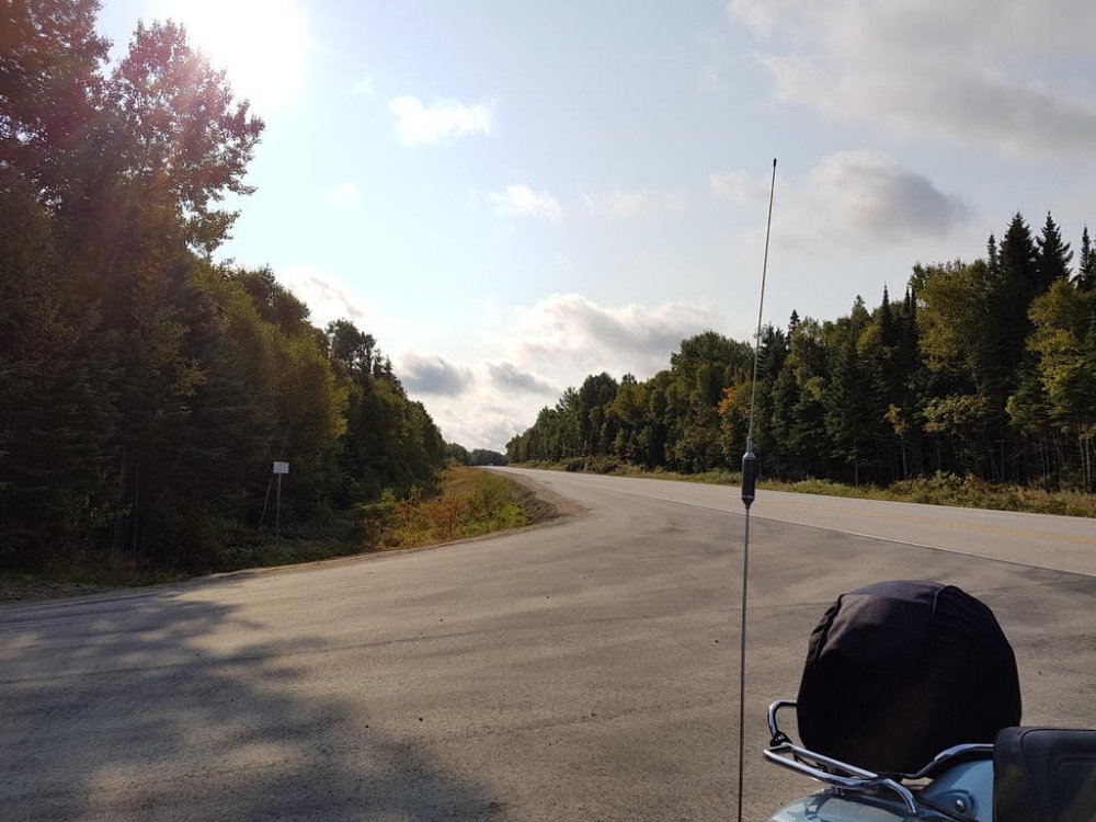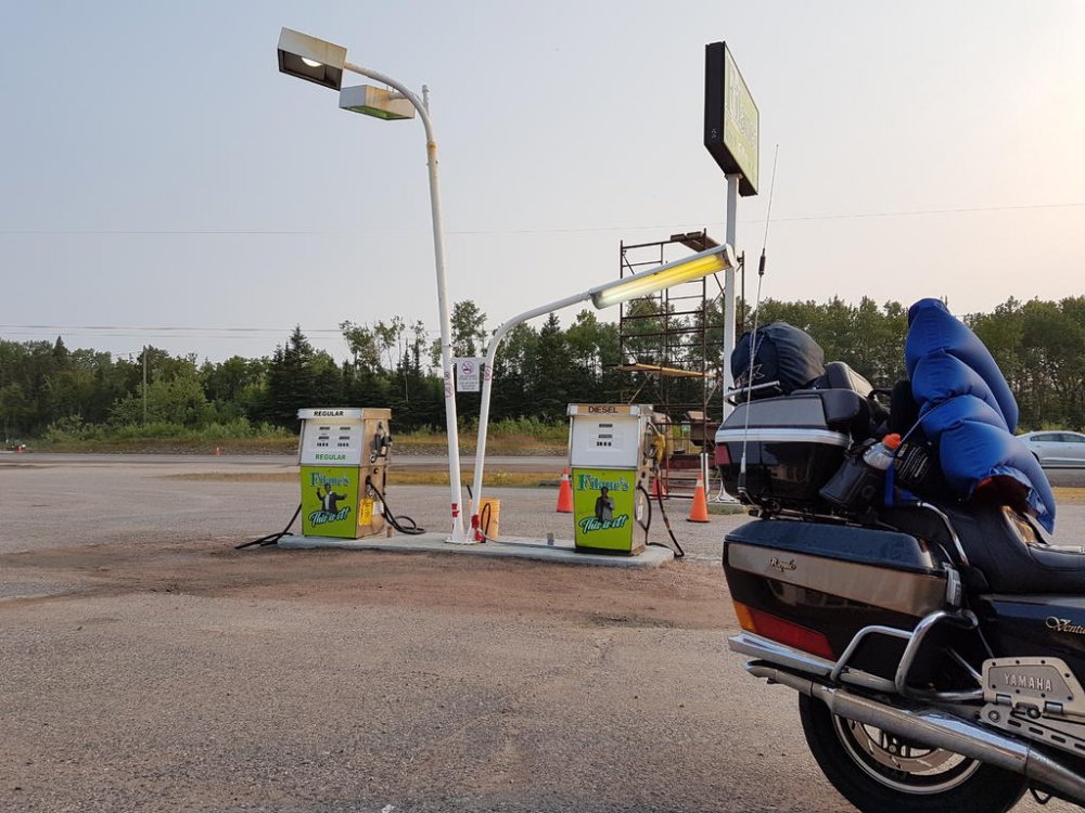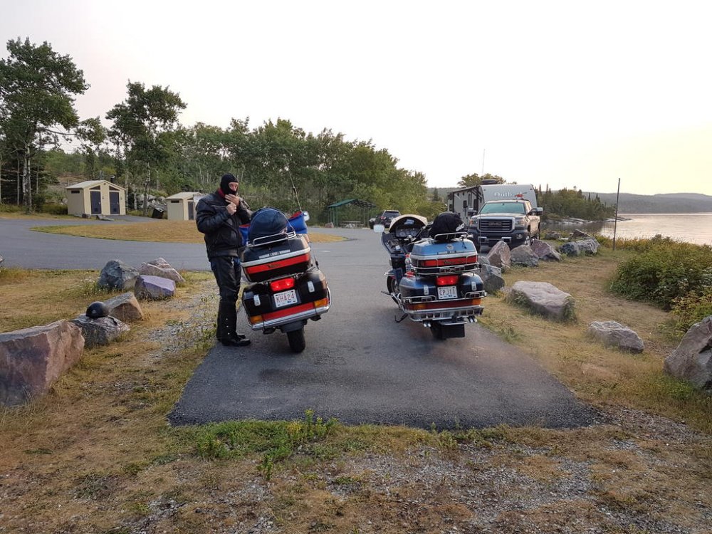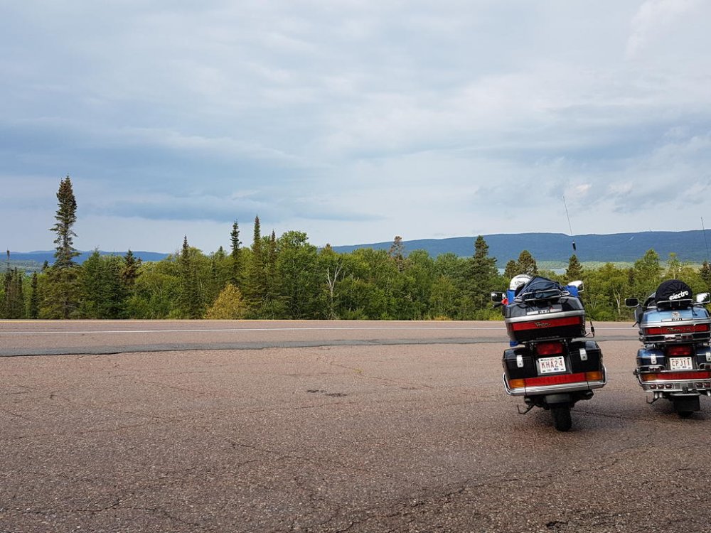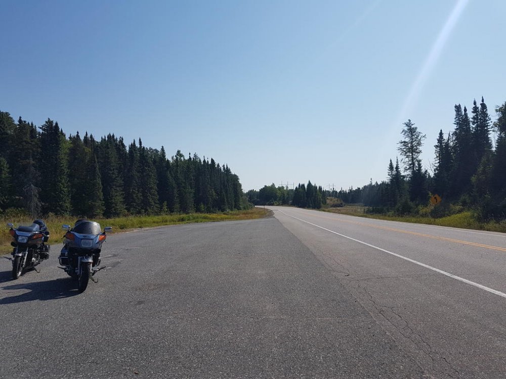 Once we hit Moose Jaw SK.’s fill ups were like 3 LTs less than I was burning…Hmmm SK. is one of those real steady riders, every glance in the rear view he’d be right on Q; but oddly enough always looking over his shoulders, like he was sitting on a train taking in the scenery;) lol Well one day my right hand started acting up it’s a rebuilt, anyways the thumb and wrist loose mobility. So reaching over with my left I engage cruise, then relaxed my grip; then I get the bright idea to rest it on the control housing? A little bit down the road my bike stall’s around 140klm? When I realised what was happening, 5th still engaged I flip back the flipping kill switch - so freaking funny man… SK pulls up beside me gesturing to pull over cause he’s thinking I had a blowout and didn’t realise. So I pulled over and he walk towards me removing his helmet and staring at the tire; well guys picture the confused look on his face all covered in soot! Right there on the shoulder middle of the prairies, we had one of our best laughs ever… Finally we broke into Ontario, beautiful roads, amazing diversity to be found in the people that settle in Northern Ont. The OPP I thought handled all types of groups very well; but those logging trucks man when they fly past, what a storm they generate. Well one afternoon around the lake head my rear began wandering and my front was hunting fiercely, I began regretting not making the time to swap rubber but they still had very good tread.. I began riding up but still fishen around in the rear so I looked for a spot to pull over and I found a service road and turned in. Being at the lake head you are quite high above the water it is high hill country. The service road had a level plat toe then went straight down to the water front where there is a hydro plant! Well I couldn’t get the bike on the side stand and she laid over on me snapping the toes and elbow and really really hurting my pride! SK. Helped me get her back up, we then pumped the rear and I taped up and we carried on!