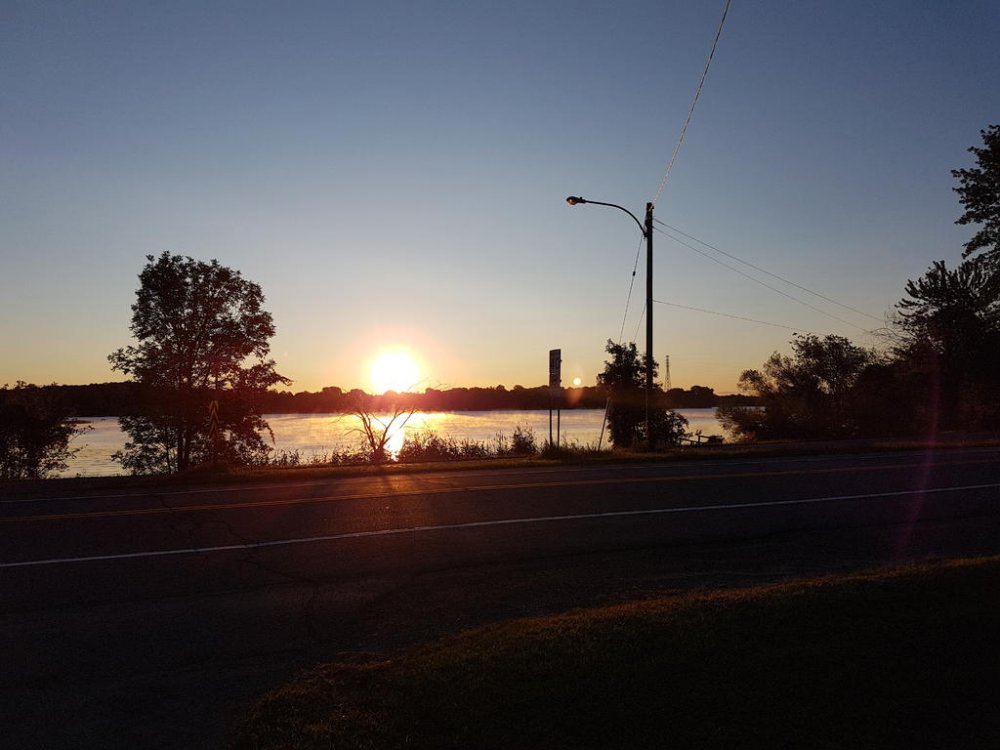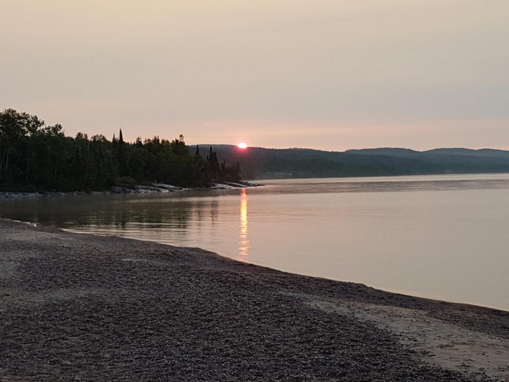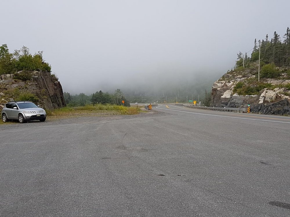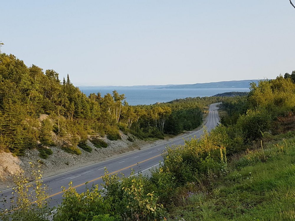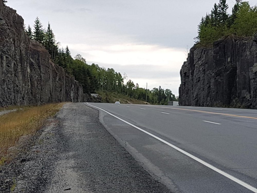 Once we hit Moose Jaw SK.’s fill ups were like 3 LTs less than I was burning…Hmmm SK. is one of those real steady riders, every glance in the rear view he’d be right on Q; but oddly enough always looking over his shoulders, like he was sitting on a train taking in the scenery;) lol Well one day my right hand started acting up it’s a rebuilt, anyways the thumb and wrist loose mobility. So reaching over with my left I engage cruise, then relaxed my grip; then I get the bright idea to rest it on the control housing? A little bit down the road my bike stall’s around 140klm? When I realised what was happening, 5th still engaged I flip back the flipping kill switch - so freaking funny man… SK pulls up beside me gesturing to pull over cause he’s thinking I had a blowout and didn’t realise. So I pulled over and he walk towards me removing his helmet and staring at the tire; well guys picture the confused look on his face all covered in soot! Right there on the shoulder middle of the prairies, we had one of our best laughs ever… Finally we broke into Ontario, beautiful roads, amazing diversity to be found in the people that settle in Northern Ont. The OPP I thought handled all types of groups very well; but those logging trucks man when they fly past, what a storm they generate. Well one afternoon around the lake head my rear began wandering and my front was hunting fiercely, I began regretting not making the time to swap rubber but they still had very good tread.. I began riding up but still fishen around in the rear so I looked for a spot to pull over and I found a service road and turned in. Being at the lake head you are quite high above the water it is high hill country. The service road had a level plat toe then went straight down to the water front where there is a hydro plant! Well I couldn’t get the bike on the side stand and she laid over on me snapping the toes and elbow and really really hurting my pride! SK. Helped me get her back up, we then pumped the rear and I taped up and we carried on!