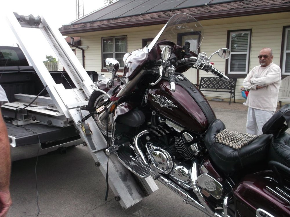I have hauled my venture in my toyhauler for years. The Harbor freight wheel chock is bolted to the floor and when I arrive at destination, I unbolt it and all that is left are the well nuts that I put in the floor. As far as the ramp, two 2x4s cut to about 5 or 6 feet are put down where the ramp meets the ground. That way I can "walk" the bike up or down the ramp and my feet still touch. The boards store just about anyplace when traveling. Works great.