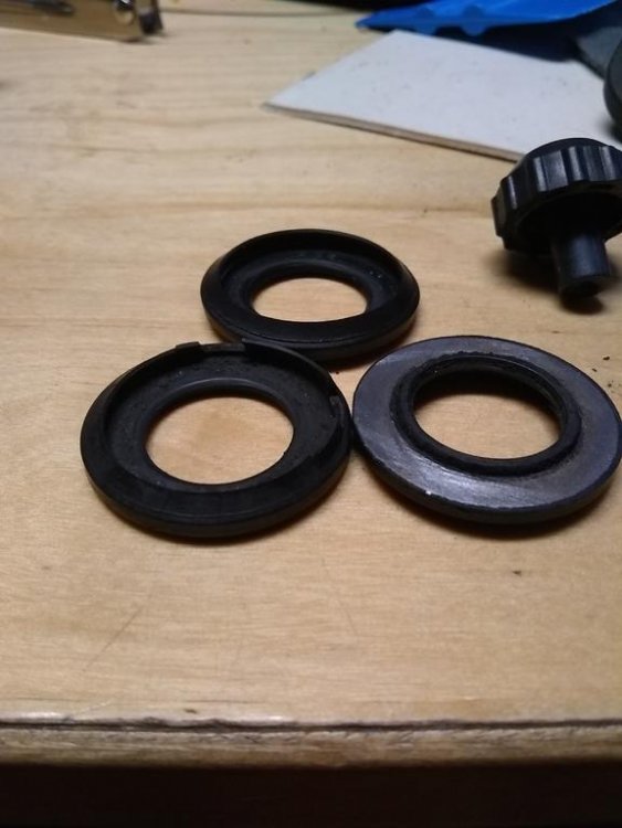 Seals on the back/underside! The Large seals are from the Swing Arm/Arm and Arm 1; I sure remember seeing the small ones but I hope some one here can help me figure (I think they are item # (s) 34 or 36 on the 1988 XVZ13U parts book) out where they came from! I know I need at least one large seal, can I get an opinion on the condition of the small seals please? Well I went out to the shop and did some cleaning and investigatin' And I learned where these dust covers go, How many here still (if you're aware you have them) have these on their bike? I'm thinking a bit of rubber sheet or leather on a washer would be almost as good, especially for the price they cost and the non availabilty from Yahama, are there any suitable substitutes? This pic shows some dust/thrust covers and the swing arm seals. Here are some more pics of JUST the dust and thrust covers.