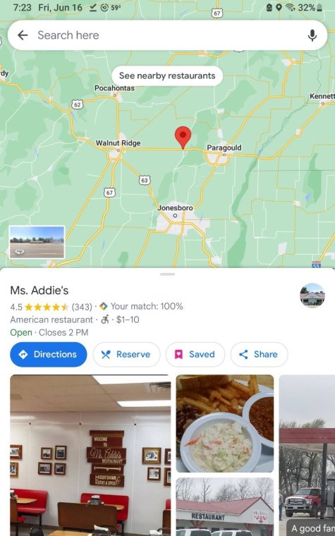Coming out of Little Rock 5 years ago... And was heading northeast on 167/67.... At walnut Ridge I turned east on 412. Started looking for gas. None around. On fumes I came across Ms. Addies. Small restaurant with a gas island on the right. And it was open! Got gas. Ate lunch. Cute little place and a life saver if you happen to be in the area.