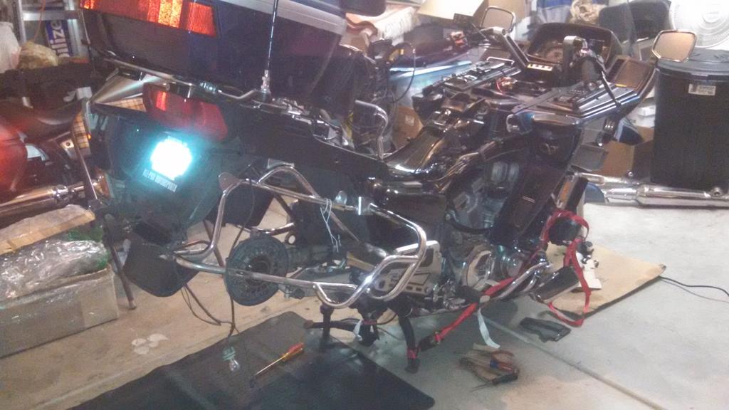 Thank you! And so will yours when you get done. Here is a picture of the first time I took the rear end apart to grease the rear end and found a broken drive piece....Someone on the forum called the position "Kneeling". The front wheel off and the bike resting on the front forks. This gave me room to take off the rear wheel and get in there and clean and grease... I can't believe I did this with very little knowledge of this bike...