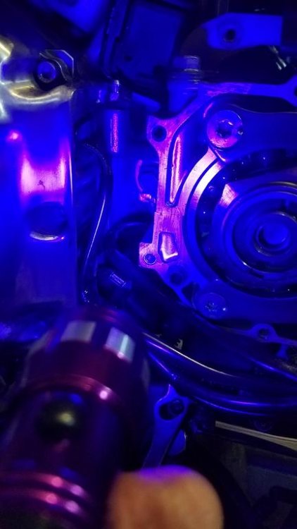 UPDATE: OK..back home in GV. Went for a nice fast ride yesterday to stir up the dye in the oil... Took cover 2 off this morning to look for the pesky leak....nothing. No dye visible on the stator wires, the neutral switch assembly, the clutch slave assembly or the shift shaft. General view looking into the area....BTW, WalMart has the UV flashlight, $10 in the fishing department, it's a small Ray O Vac uses 3 AAA batts and is bright. It will go in my road tool kit for sure. Good for bugs and such as well. Shift shaft area is clean as well..... I turned off all the lights in the garage and looked all over the motor. From the valve covers down...including everything in between. The oil/water "twinkie" area between the cylinders is dry as well. One drop of oil was seen under the rubber cover that covers the U-Joint...but I think that came from oil running back. That area is to far back since my drip is right under the area where the slave/stator wires/neutral switch/shift shaft are. Even under the motor...the pan area...is clean. No green dye seen. So...where do I go looking now? I would appreciate any ideas....