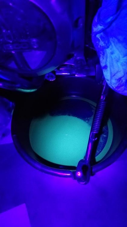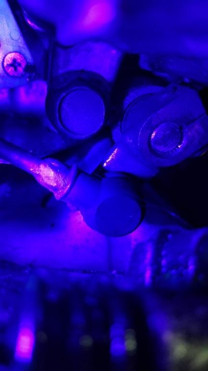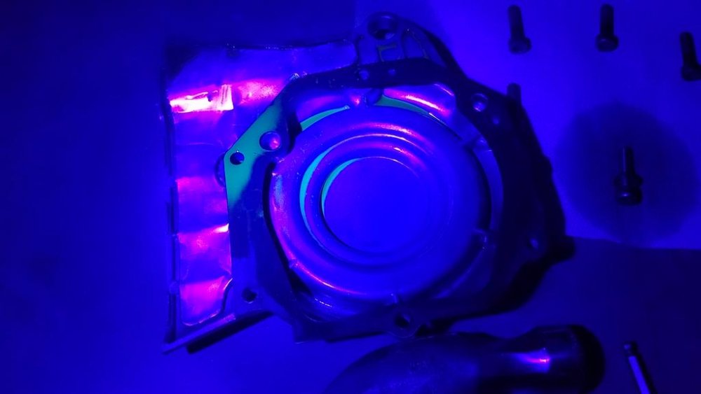 The dye definitely got into all the oil. It drained out a bit when I took off the cover. Look at the green tint from the UV light reflecting off the dye. Can even see it on the cover that I haven't cleaned yet...in the upper left corner of the cover there is still oil there.... I have a feeling I'm going to have to live with it for a while, though I do get tired of the drops on the floor. She marks her spot now, every time I shut her off after a ride. Grrrr...