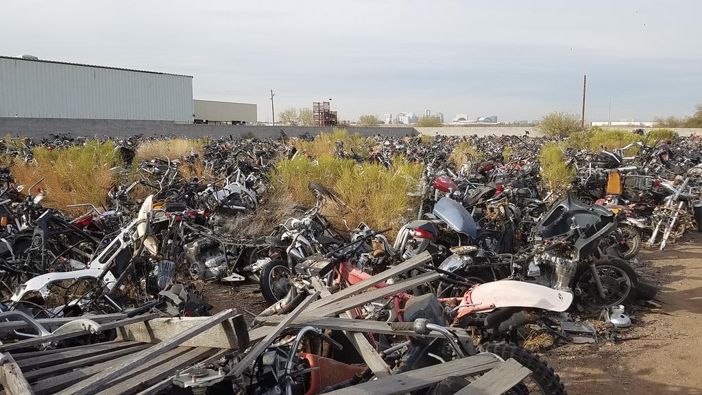 YIKES! Dropped by this place in South Phoenix this past weekend. They have one section that is almost all Yamaha. Saw 6 early 1st gens and 1 later model 1st Gen. Sad to see the bodies, engines and pieces just sitting there. No plastic at all...darn it! If you Google map the place...the Yamaha section is the entire Northwest quadrant of the yard. http://www.bobusedmotorcycleparts.com/index.html Here are my pics I shot. I did see some choke levers I didn't know existed.....! Looking NW... NE... Behind me Pat is looking for V4's! A rear shock with schraeder valve Sigh.... Oh...saw this 1600. Totalled by insurance. They want $2300 for her. She looked pretty good...just road rash on right side. Someone has already put a claim on her....