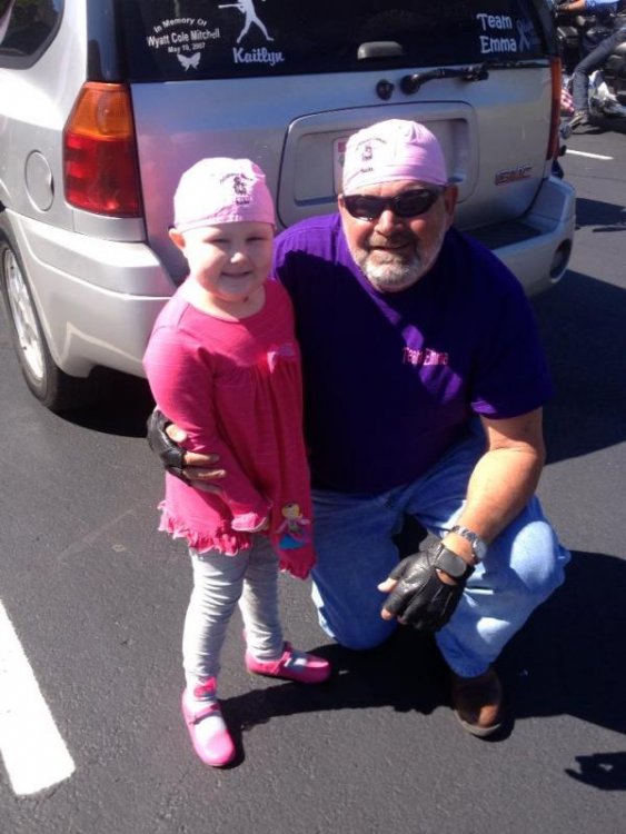 I just wanted to share with everyone, a picture of the reason I am painting my bike purple, in the memory of Princess Emma Mitchell. She was my sweetheart, even though I only knew her for a short 1-1/2 years prior to her gaining her heavenly wings. I have had a few great honors in my life, and 2 of the greatest involved her. One was the day I did a bike ride for her and I intentionally put myself in the rear of the ride so I could stop and give her a hug as we rode by her at the back of the church (she wasn't really supposed to be around a lot of people at the time, high risk of catching something and she passed away less that 2 months later). And the greatest honor, was being asked by her mom to be one of the 4 pall bearers. Out of all the family members and church members, me, someone she only known for 1-1/2 years, had been loved enough to take such an honorable position. This photo was in October 2013 at a halfway point of a bike ride for breast cancer. Emma came out to meet us at the restaurant originally to have lunch with me, but ended up having to go pick up her puppy that she finally got permission from the doctors to have. I told her that if she would hear her pink doo rag I gave her, that I would wear mine and my purple and pink Team Emma shirt. This video is July 19th of last year, 2 months before she passed away. I put on a bike ride for Team Emma to help them with all their expenses and her and her family were at the back of the church when we came thru. She was supposed to have brought me a pink tutu to wear.