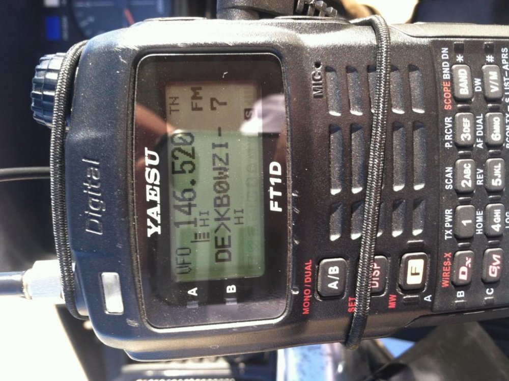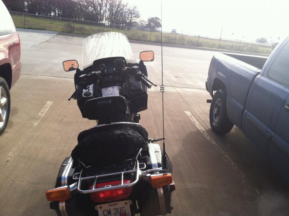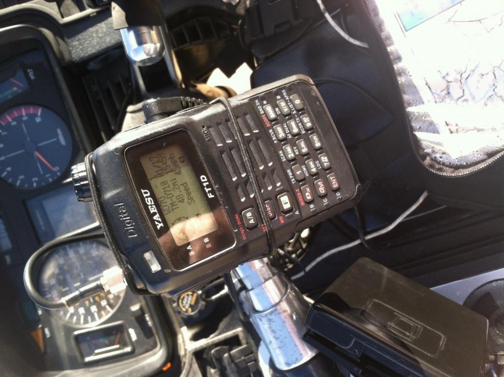 Hi Larry, nice to meet you. Let me know when your in town for sure. Yes I am a ham too. KB0WZI. I do have a yaesu ft1d ht mounted with a ram style mount off the handle bars. The where the factory antenna was I put a nmo style mount with a 5/8 wave dual band antenna. I use this radio for the APRS feature. My family at home can track my trip off of findu.com. http://www.findu.com/cgi-bin/find.cgi?kb0wzi-7 i have a sigma Bluetooth headset and they make a Bluetooth adapter with a PTT plug that will hook the radio wirelessly to the headset. I don't have the adapter as of yet but next $150 I will. Mainly just APRS now. It transmits every two minutes. Some areas don't have coverage though but it is cool. Let me know if you have any questions. I'll try to get you a picture maybe tomorrow. Also the radio is water resistant. It has been rained on and through the car wash. Lol. Seems to work. -