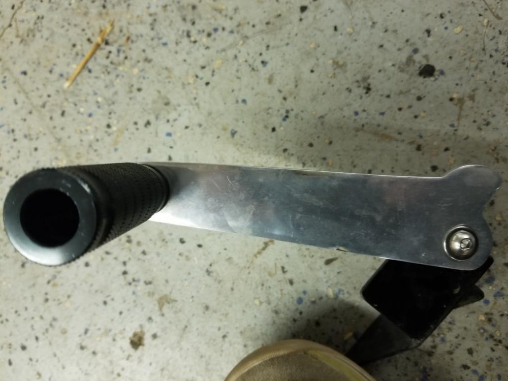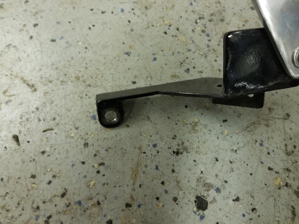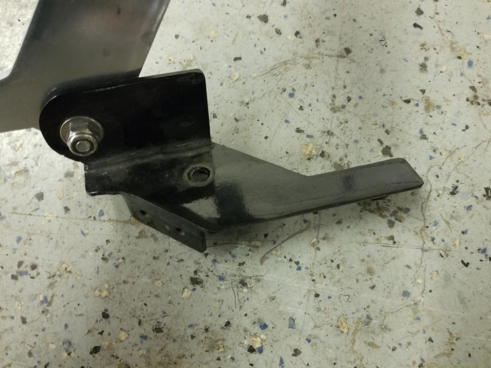 Here is a close up of the bracket. I didn't have a way to make the necessary bends so I made 3 tabs to weld on the top plate of the floorboard cover. One tab has a hole that aligns with the rear mounting bolt of the floorboard, the second one fits against the front of the floorboard and the third on bolts the arm to the assembly. I then aligned it with the floorboard and drilled down through the plate and floorboard and put a stainless steel bolt down through it to secure the front of the plate. Ron