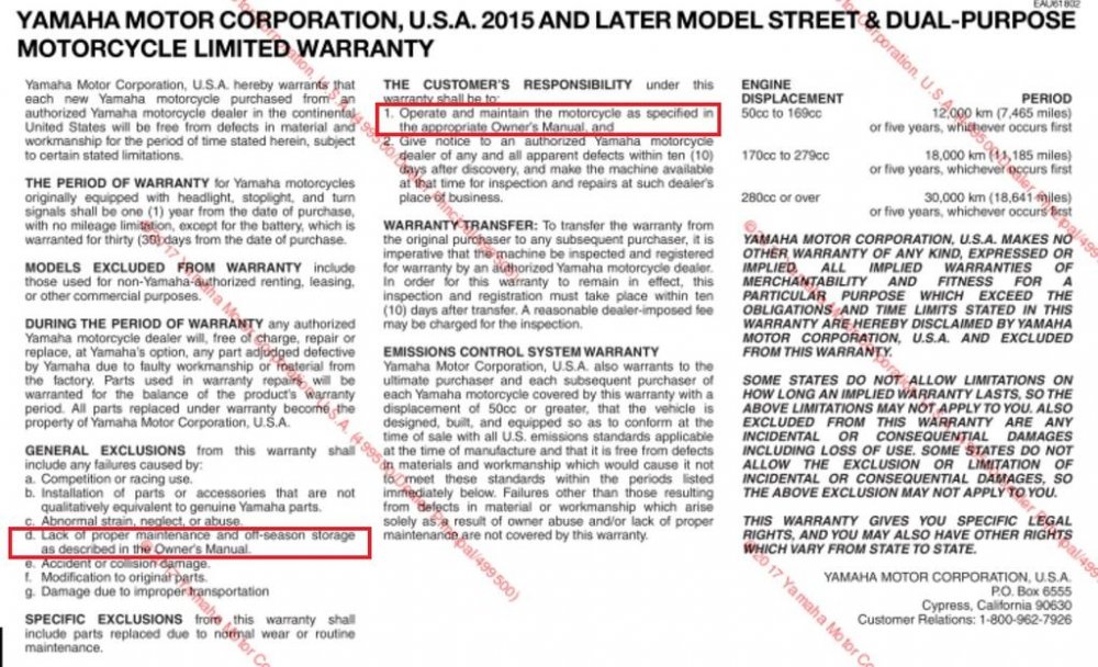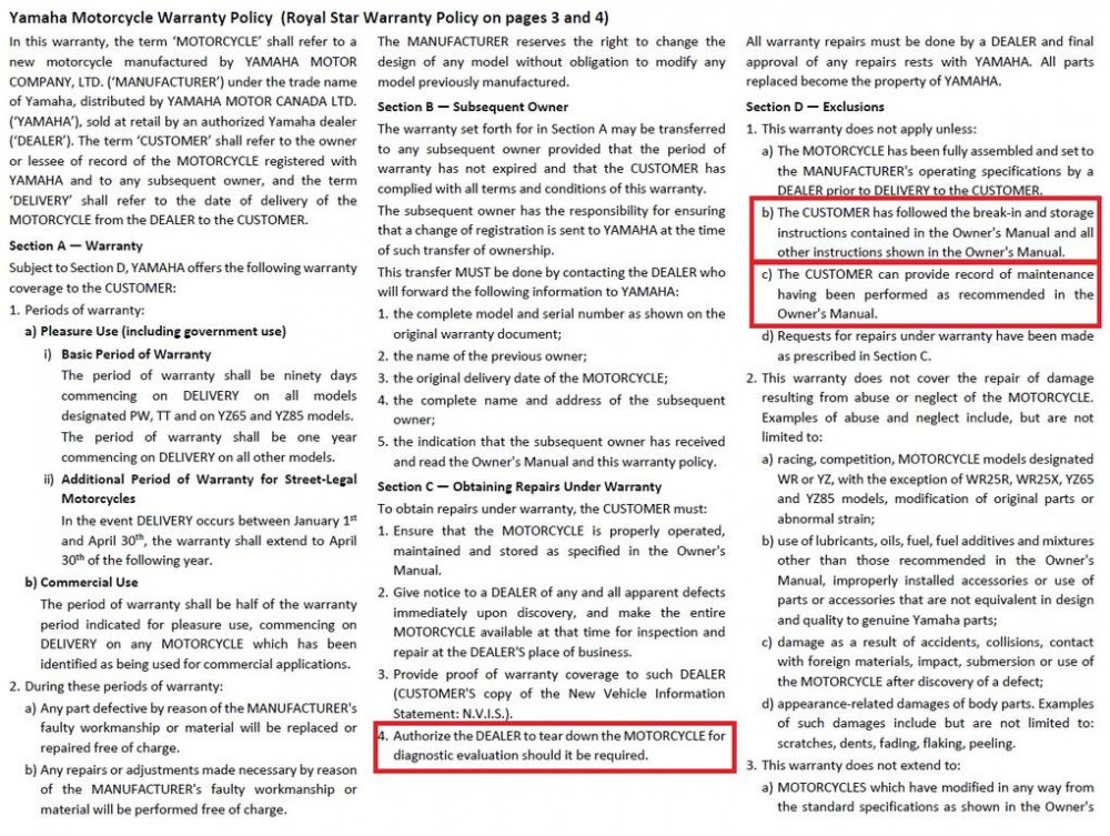 To @bucfan11 and [MENTION=20576]RonK Here is the Yamaha USA Warranty Here is the Yamaha Canada warranty I am not a corporation, so if Yamaha cannot show you the light I do not stand a chance. By the way, I do not work for, or have anything to do with Yamaha, other than spend my money with them like you do. I understand you want to save a dollar, but if you cannot do the work yourself, the price of admission to this hobby is a little more costly if you have someone else do the work. By all that is written from the manufacturer, the work must be done. If you want to play Las Vegas odds with your machine, and your life, by NOT performing maintenance, for whatever reason you dream up, that is YOUR business. I am amazed that one would spend the initial amount of money on a brand new bike like yall have, only to somehow rationalize NOT spending any more money on it in the form of required maintenance. Oh and @vzuden, just like yours, my bearings only had two drops of grease on them from the factory as well. -
