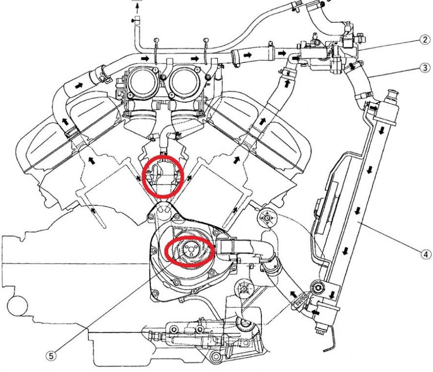Just gettin broken in. What caused this condition to happen in the 1st place? I bet you mean it is mixing oil with the water. To "pass straight through the overflow" I don't know what that means. 1. I am wondering about your shop guys and "rough" head gaskets at 95K. Why? Was the coolant bubbling in the radiator with the cap off? A head gasket leak will "eat-burn-drink" coolant causing the coolant to go low, while producing exhaust gasses in the cooling system. A head gasket will have a witness fail mark on it where the coolant and the combustion process meet. Did they show you this gasket? 2. I agree with replacing all coolant lines, thermostats, radiator caps, water plugs, and flushing oil out of cooling system especially on a bike that has been in trouble and has 95K on it. 3. The three places water and oil could come into contact are: the head gasket, the "twinkie" crankcase breather, and the water pump seal. Any area that has been replaced already is not absolved from being guilty of mixing oil and water again. Bad assembly, using no sealer, reusing old gaskets instead of new, can be contributing factors to failure...again...and again.