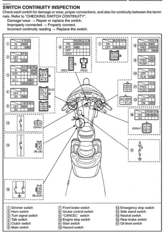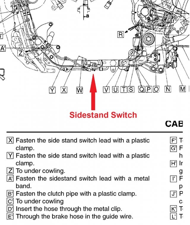 You are looking for a BLUE connector that has a black wire and a blue wire with a white strip on it. There may be a pigtail connector on the left lower foot cowling, otherwise the book shows that it is under the tank (easier if you just trace from kickstand switch through lower left foot cowl once it is off . However, I am still thinking fuse or bad ground (cause it is easier, and it at one time cranked recently). Also, the bike does not care about the position of the kickstand as long as you are in neutral and of course the neutral switch is working. Did you get the Service Manual from here yet?