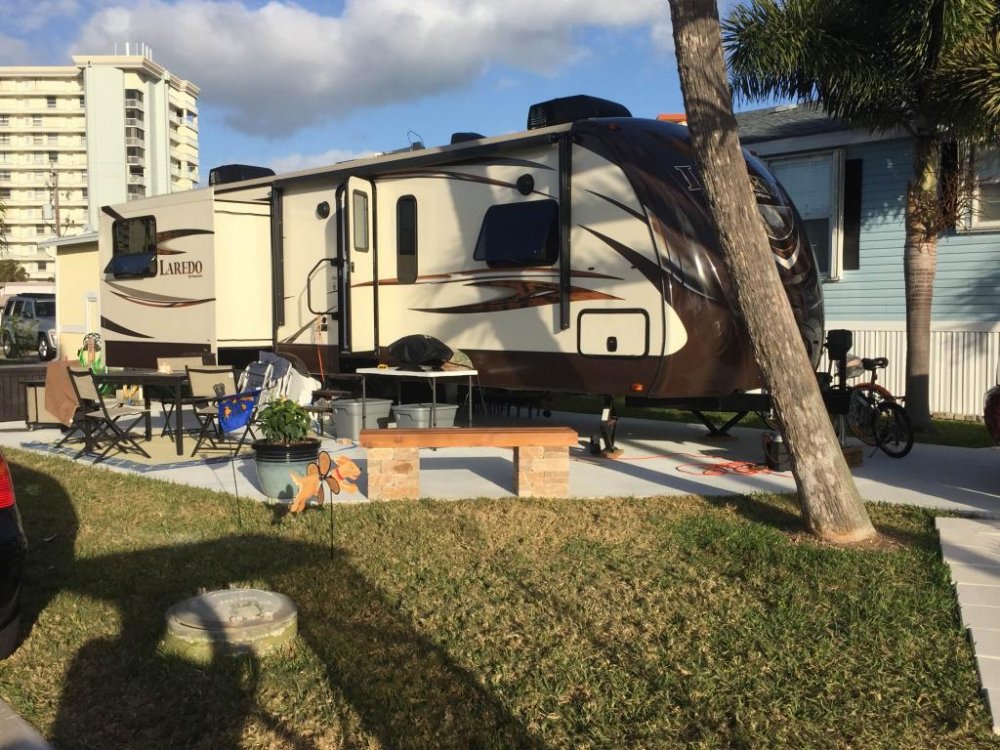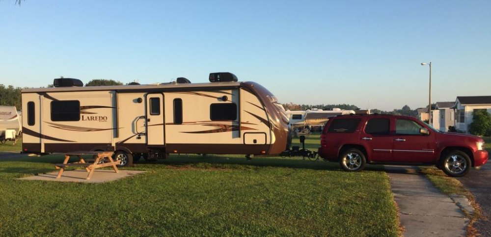 Here it is set up on our lot in Florida. We're not weekend campers. We only use the trailer as a winter home. Pull it twice a year. About 150 miles to put it on the lot in the fall and return it to storage in the spring. I really don't have enough tow vehicle because I am towing a bit over my limits. But we go slow and it is fairly flat in Florida. The Tahoe handles it fine as long as you don't look at the numbers. The short wheelbase of the truck helps when trying to back it between two trees on the lot. It's a fairly narrow street.