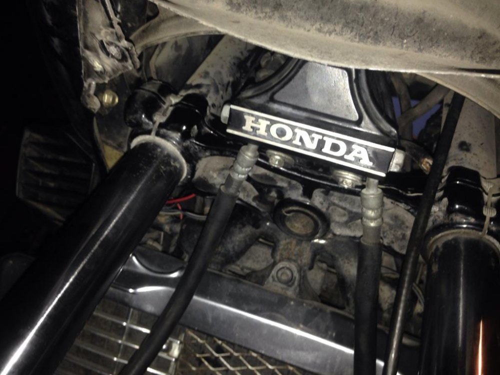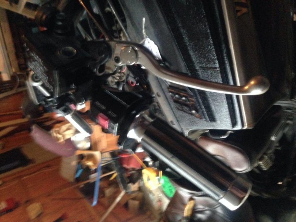 I have brakes! I used the lower brake lines, banjo bolts and split from a Honda Sabre. The I used the main line from a Virago 535 and finally the master and lever from a 2010 fz6r. the upper line is too long so I had to route it west to LA then back East to NYC. I just need to splice the wire going to the brake switch, zip tie the splitter to the lower triple and Ill be done. Anti dive is history btw. No road test becuase of rain but lever feels great. At the rear I used a stubby bolt (with big copper washer stolen from a head bolt) that I stuck into the master to block off the line going to the front. I had to grind off that little nub on the master that the oem line buts up against. Rear brakes feel great as well. Very happy, total cost of Zero dollars on this fix. edit: I juste ordered a set of front brake pads for it 10$