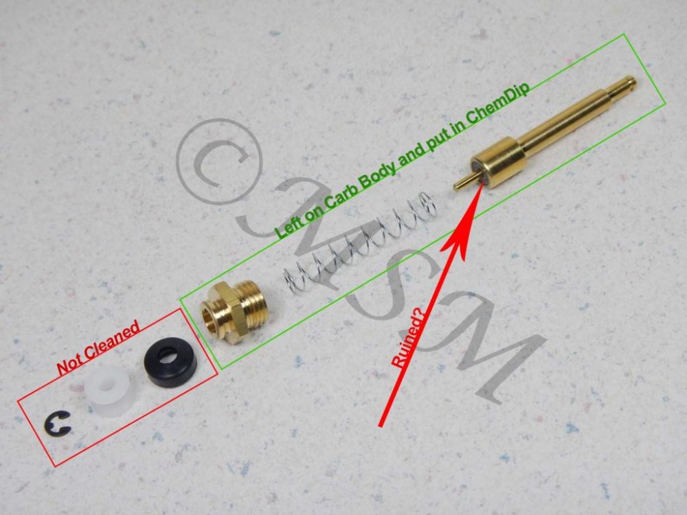 1997 RS Hard to start after carb cleaningbrummers replied to brummers's topic in Royal Star Venture Tech Talk ('99 - '13) This is the best photo I could find of the starter for the 28mm carbs on my '97. I've marked what I left in the carb body and was subject to the Berryman's Chem-Dip cleaner. It appears there is a non metallic bushing or sealing surface on that piston. Can anyone confirm this? Does the enrichment valve add more fuel for starting or lessen the air?