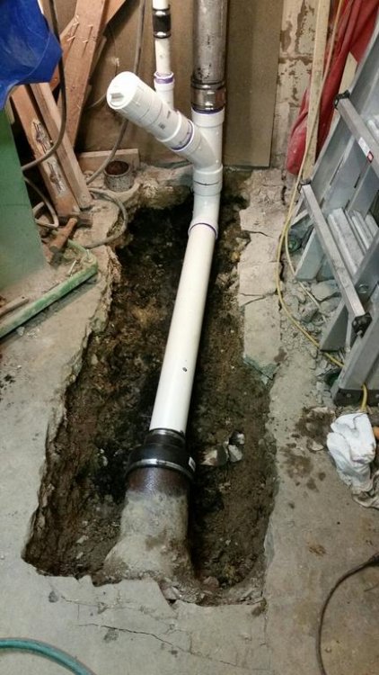 Well I have it all connected, at least for now. I have used a combination of many ideas that you all have given me. Thanks a bunch.This will need more work down the line but at least it is usable for now. Where that 4" PVC enters the clay it is pushed all the way down to the first other connection so that when I dig that one up the 4 inch PVC will be there. I have to get all of the other connections done because after these connections the main line makes a 90° bend still under the basement floor. Even the places that do relining said they can not go around a corner and would have to break out floor and dig holes at each drain connection and at that 90°bend. But I am hoping that I can at least tackle the rest of this on my terms and when I have time and funds planned for it. Here is an idea of just how thin the concrete is over the pipe and this is after 10' of drop. At least the 4" pvc will allow an additional 1.5" of concrete floor. Here is what it looks like now I have added some supports under the pipe that are not in this pic. I will leave the hole open for a while to let the dirt dry out before I add the gravel and cement over it. BUTT Yippie, we can use the toilets again and after 2 days in that stinky hole it really felt good to take a shower.