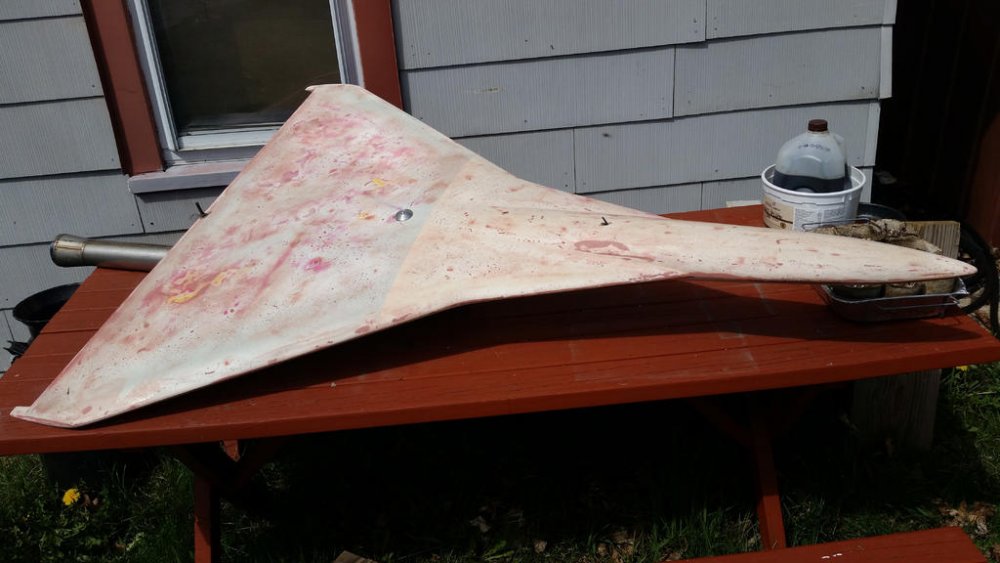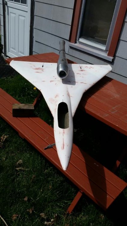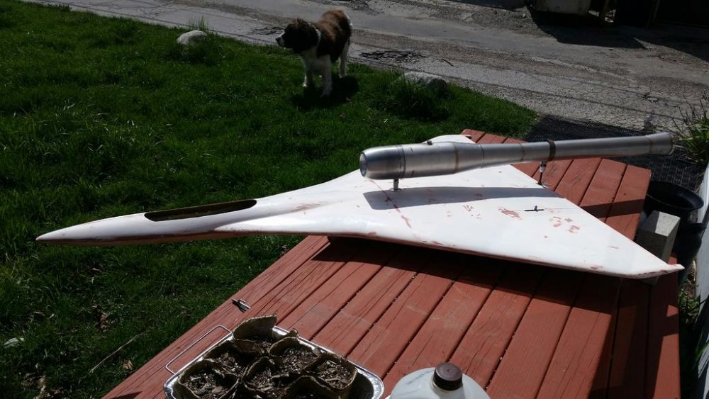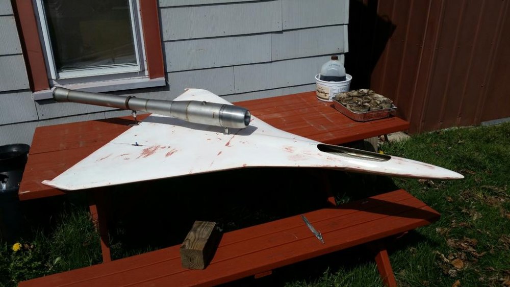 Well here are a few pics to wet your appetite. It sure does not look a lot different from when I started, but there is a lot of time wrapped up in it already, most was filling and sanding and the early parts of paint prep. The pulse jet is just temporarily mounted to get a rough idea on where the CG is headed. It looks like everything needs to be as far forward as it can go and I will still need a lot of lead in the nose. This also means that there is no reason to skimp on any structure up front. @cowpuc -