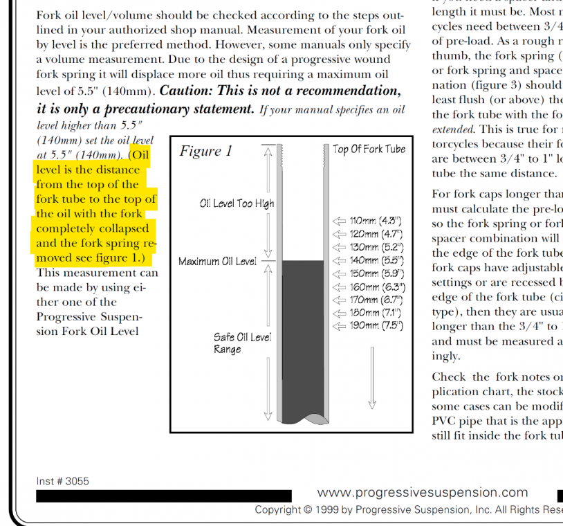9. In the instructions that came with my springs back in about 2004, Progressive says oil level should be measured with the springs out. Have the instructions changed since then? Oddly, I don't see instructions for the Venture in Progressive's current tech section: https://www.progressivesuspension.com/install-sheets/metric. @Pasta Burner: When I installed the springs back in 2004, I didn't think about exercising the forks to make sure oil filled all the nooks and crannies before I checked oil level. When I rebuilt the entire front end a few years ago, I put oil in and exercised the forks several times to distribute oil. I was surprised by how far the oil level fell from the initial fill. Something to consider if you go back in. Progressive Spring Instructions.pdf