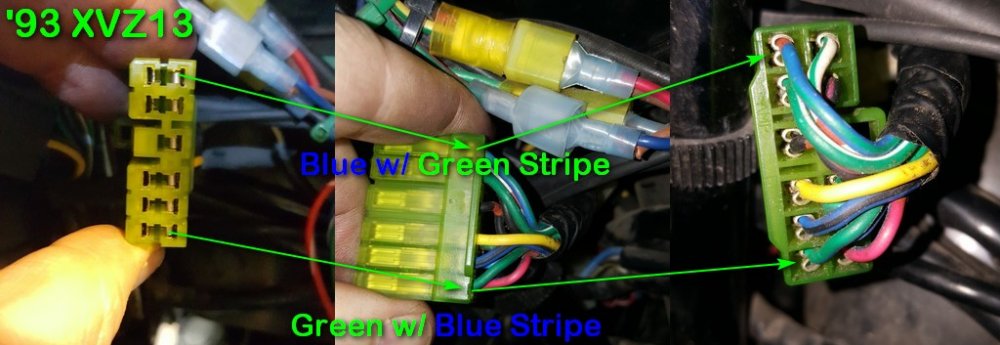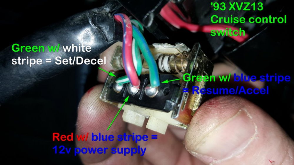 I found a mis-identified wire in the cruise control troubleshooting procedures on page 7-150. Holler if you think my connector is wired incorrectly or if you think I've made a mistake. The wire colors on my cruise control unit connector are: The wires on the cruise control Set/Resume switch are: The troubleshooting step for checking the function of the Resume/Accel position on the switch incorrectly says to check the blue with green stripe. The correct wire to check is the green with blue stripe. On my bike, the blue with green stripe has constant 12v power, which gave me the false indication that my cruise control switch was malfunctioning. Once I checked the green with blue stripe wire, the circuit properly changes from 0v to 12v when the Resume/Accel switch position is activated.