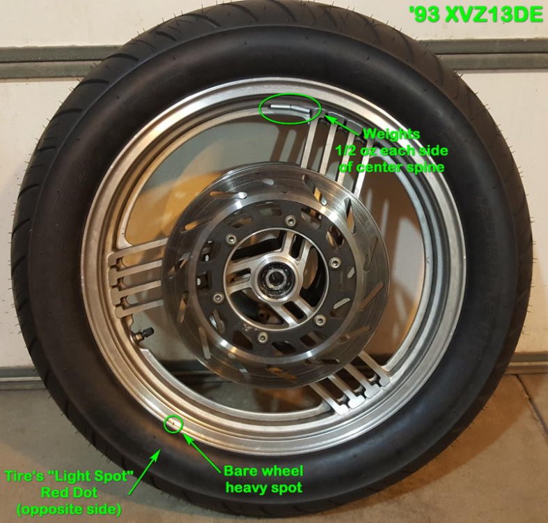 To balance the tire, I aligned the Shinko tire's "light spot" red dot with the bare wheel's heavy spot. I did this because of Shinko customer service saying I should align the red dot with the valve stem. While this would seem to indicate the red dot is the tire's light spot, customer service would not directly tell me what the red dot signifies. I still had to add the ounce of weight about opposite the bare wheel's heavy spot. It's crazy: I spent an hour with the Googles and no one can get their stories straight when it comes to tire dots. Yellow is supposed to be the light spot. Red is supposed to be the spot of maximum radial runout (the "high" spot on the tire). Most say align the dot--red or yellow--with the valve stem but they make the (incorrect) assumption that the valve stem is the heaviest spot on a wheel. Further, by saying the red dot always takes precedence and should be aligned with the valve stem, they all seem to be conflating radial runout with weight. If a high spot (red dot location) on the tire is co-located with the heavy spot on the tire, then you'd have the downward pressure of a tire bulge combined with the extra centripetal force of the heavy spot on the wheel. That might make the tire have more downward pressure at that location, which would require more weight opposite that point to balance out the bounce. Keep in mind my tire is gravity balanced, not spin balanced, so radial runout in itself is irrelevant...unless the maximum radial runout spot also happens to be the heavy spot because of the tire being thicker in that location. But then why would Shinko tell me to align the red dot--a potential heavy spot--with the valve stem?? It makes me grumpy that tire companies and internet users are imprecise and all over the map in this discussion. At any rate, thanks for the ideas, Earl.