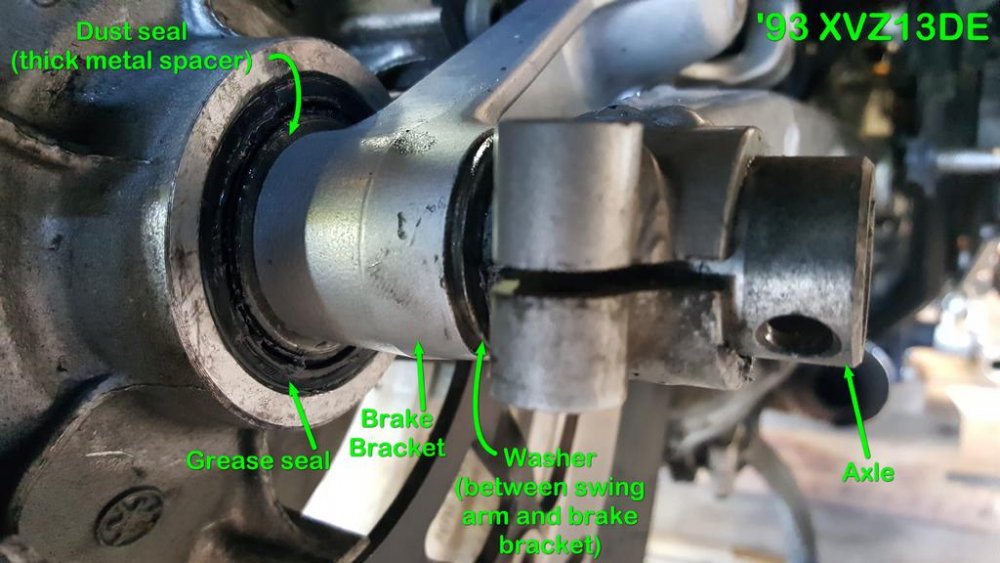 Is there supposed to be a dust cover of some sort (say, a big washer) covering and protecting the grease seal on the right side of the rear axle assembly? I'm the 2nd or 3rd owner of the bike and I don't ever recall seeing one there, but it sure seems weird that the grease seal would be exposed to the elements. The fiche doesn't show one. The #23 collar (what I have labeled as the "dust seal" or thick metal spacer on my picture) and the #28 washer that goes next to the swing arm are pictured, but I don't see anything else that could be a cover for that grease seal. Is there supposed to be some kind of cover or protection for that grease seal? Or, does it just stay exposed?