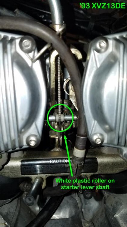 I'm baffled. Consensus says I have the primary throttle cable routed incorrectly on my '93. It's not supposed to go around the white plastic roller/bearing on the starter lever shaft. Instead, the throttle cable is supposed to go on the inside of the starter lever shaft and directly to the throttle linkage. The angle of the throttle cable bracket does seem to support that idea in that it points toward the throttle linkage rather than toward the plastic roller. Yet when I look at this area, I can't see anything that would then touch the plastic roller, so what is its purpose? It's not needed to position the starter lever shaft or hold anything in place on the starter lever shaft. Is it a vestigial remnant of some sort? I don't want to reassemble any further until I'm positive I've got everything back where it's supposed to go.