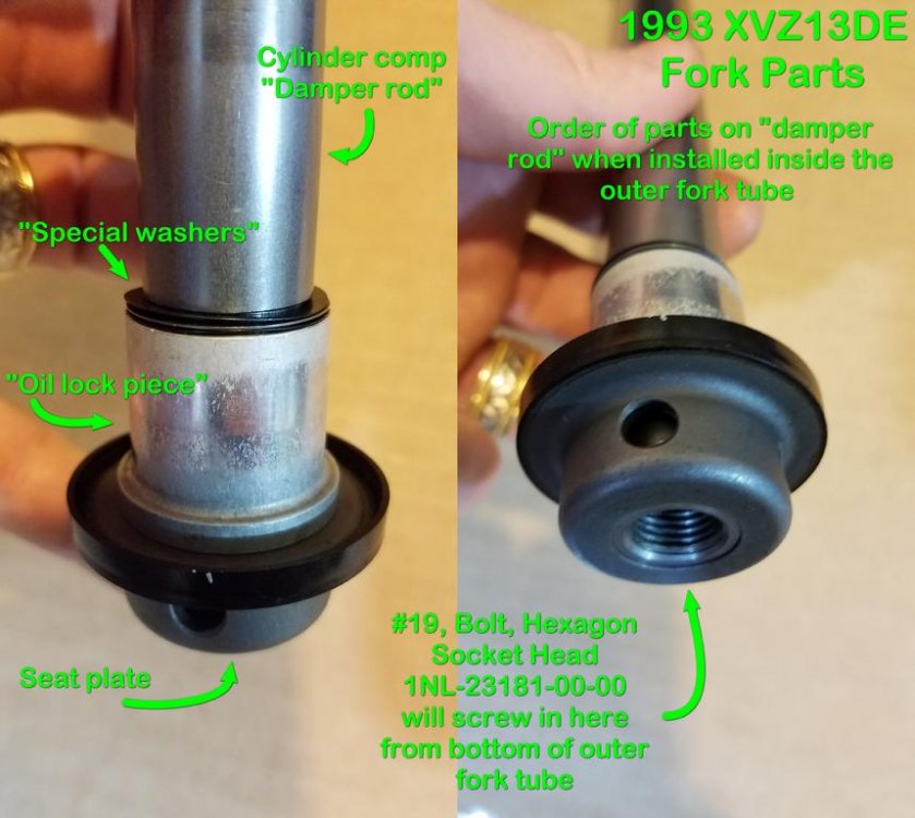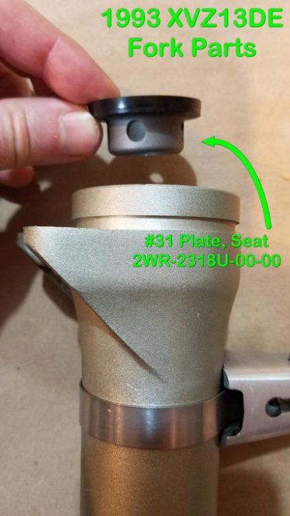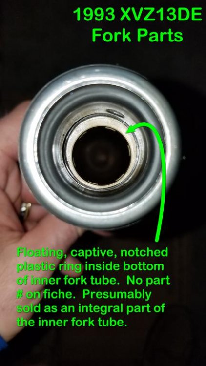 Here are a few pictures of fork parts on my 1993 Royale in order of assembly. The pictures include the official fiche names and part numbers. I hope this might help others who are trying to find the official part names and part numbers when performing fork maintenance. If I have any incorrect IDs, please holler and I'll fix it. Parts on the inner fork. The oil seal washer (referred to as the "seal spacer" in the service manual) was installed with the rounded side (smooth side with rounded edges) against the top of the oil seal. The upper spring washer (also referred to as the "seal spacer" in the service manual) was installed with the flat side (the side with sharp edges) against the bottom of the oil seal. The metal slide (referred to as the "slide bush" in the service manual) and front fork piston (referred to as the "guide bush" in the service manual) appeared consistent and not dependent on a particular installation direction. Inspect the floating, captive plastic ring at the bottom of the inner fork tube. There is no fiche part listed for this, so I suspect it is sold as a unit with the inner fork tube. Parts on the front fork cylinder comp. The service manual refers to this as the "damper rod". The service manual refers to the wavy washers--valve springs--as "special washers". The service manual refers to the taper spindle as the "oil lock piece". The seat plate is the last removable component at the bottom of the outer fork. It goes in first before any additional re-assembly. If you could see inside the outer fork tube after the "damper rod" and related parts were re-assembled and installed, this is how it would look: The numbers correspond with the fiche from https://www.partshark.com/oemparts/a/yam/50043596f8700209bc78be67/front-fork